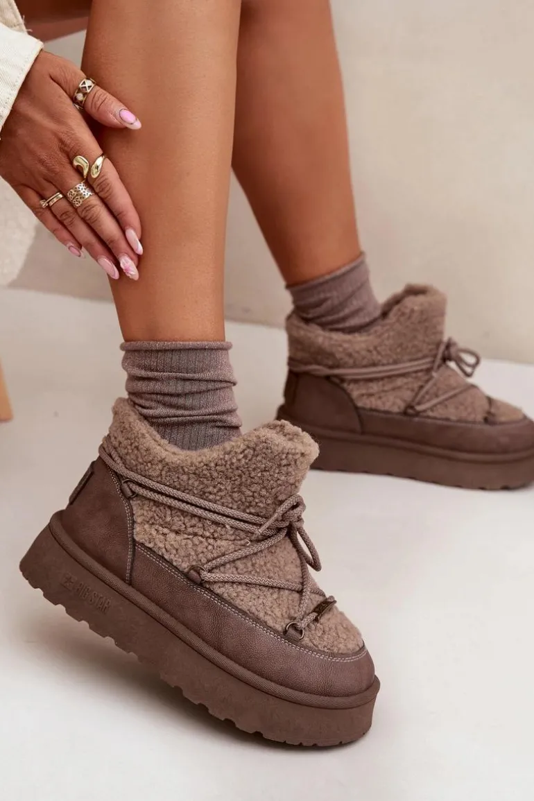 Te śniegowce damskie to połączenie stylu i wygody na zimowe dni! Wykonane z eko skóry i futerka typu baranek, zapewnią Ci ciepło i komfort w mroźne dni. Osadzone na platformie z gumowego tworzywa, gwarantują stabilność i wygodę przez cały dzień. Wiązanie z przodu daje możliwość idealnego dopasowania, a futerko w środku dodatkowo otula stopy przyjemnym ciepłem. Stylowy fason sprawi, że te śniegowce będą świetnym wyborem do zimowych stylizacji! Przy wyborze rozmiaru prosimy sugerować się tabelą rozmiarów.