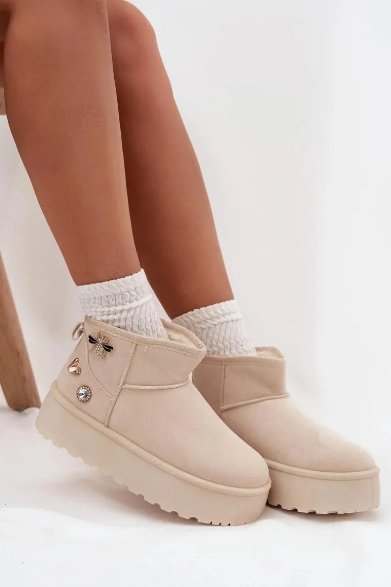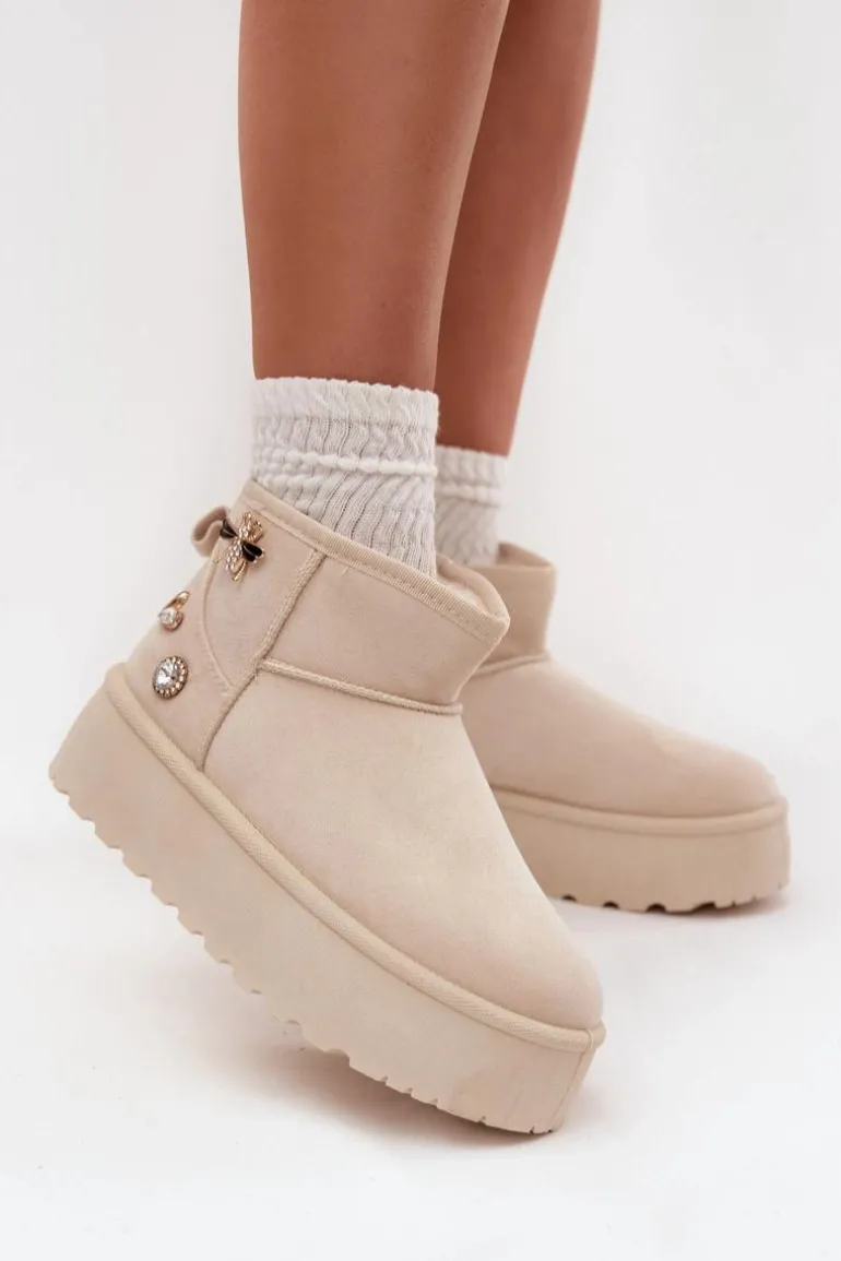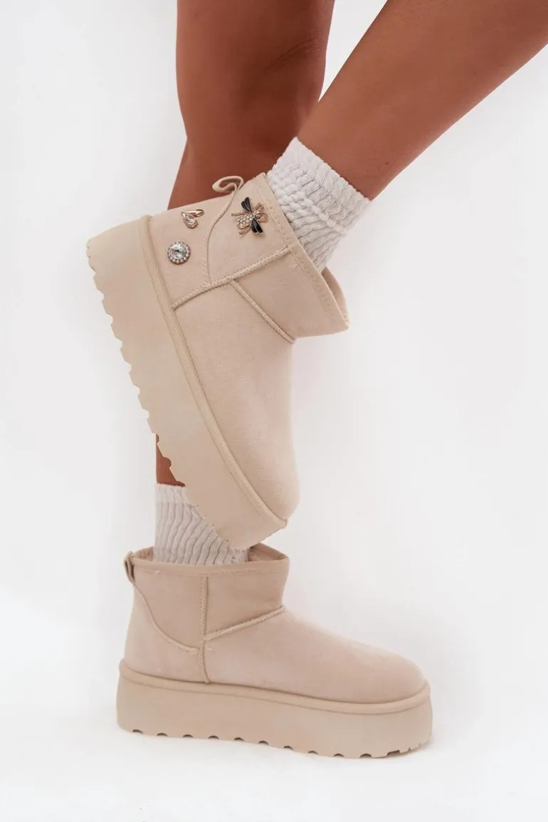 Śniegowce damskie wykonane z eko zamszu to stylowe i praktyczne obuwie idealne na zimowe dni. Osadzone na platformie z gumowego tworzywa, zapewniają stabilność oraz wygodę chodzenia, a jednocześnie skutecznie izolują od chłodu. Wnętrze butów ocieplane jest miękkim futerkiem, które gwarantuje ciepło i komfort nawet podczas mroźnej pogody. Dodatkowym atutem są ozdobne przypinki na cholewce, nadające całości oryginalnego, modnego charakteru. To śniegowce, które świetnie sprawdzą się w codziennych zimowych stylizacjach. Przy wyborze rozmiaru prosimy kierować tabelą rozmiarów.