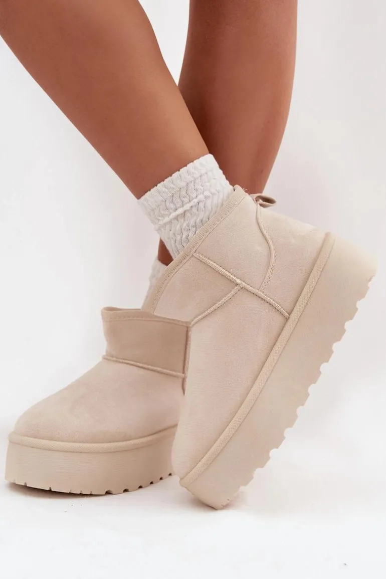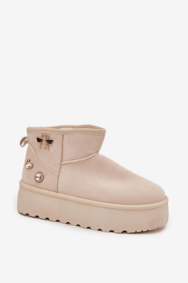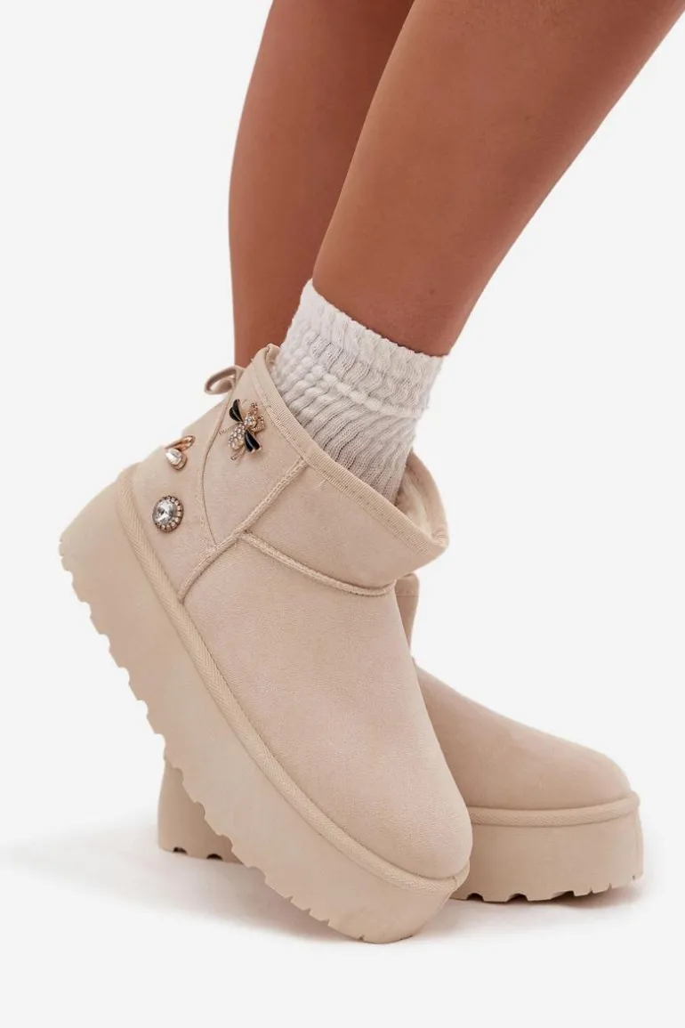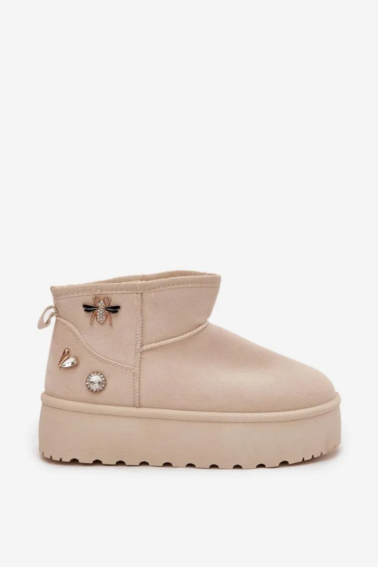 Śniegowce damskie wykonane z eko zamszu to stylowe i praktyczne obuwie idealne na zimowe dni. Osadzone na platformie z gumowego tworzywa, zapewniają stabilność oraz wygodę chodzenia, a jednocześnie skutecznie izolują od chłodu. Wnętrze butów ocieplane jest miękkim futerkiem, które gwarantuje ciepło i komfort nawet podczas mroźnej pogody. Dodatkowym atutem są ozdobne przypinki na cholewce, nadające całości oryginalnego, modnego charakteru. To śniegowce, które świetnie sprawdzą się w codziennych zimowych stylizacjach. Przy wyborze rozmiaru prosimy kierować tabelą rozmiarów.
