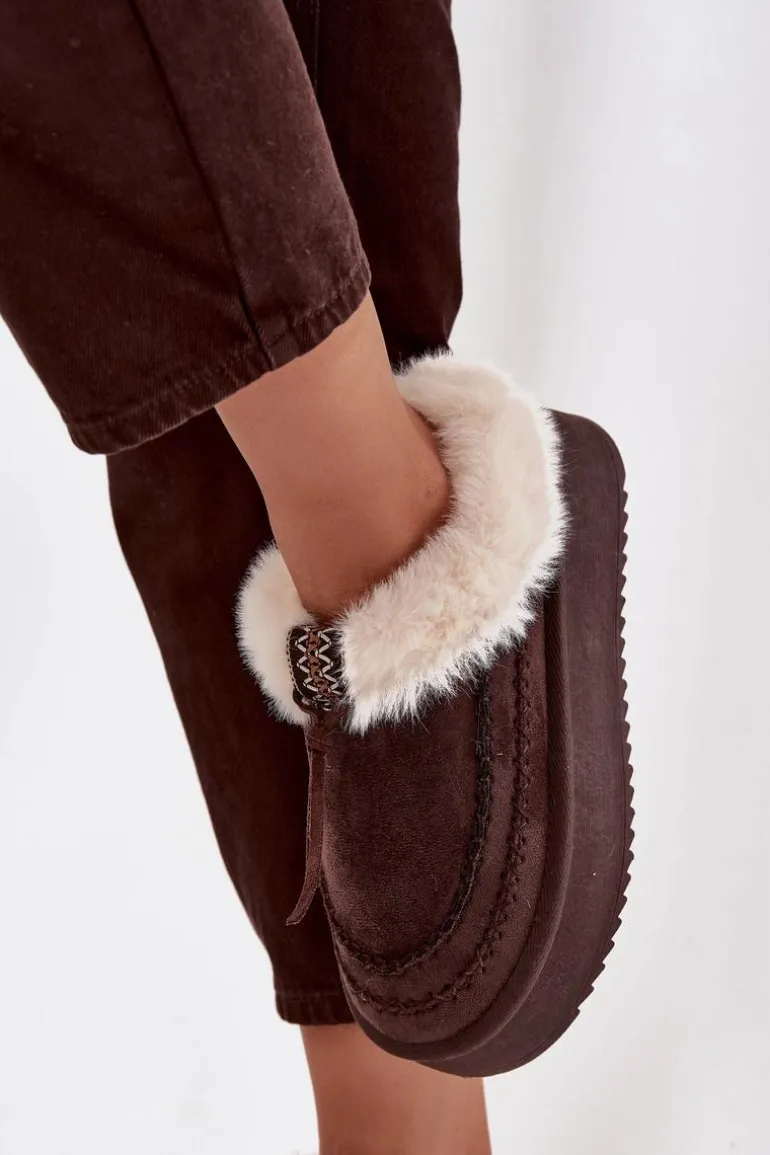 Śniegowce damskie wykonane z eko zamszu to idealne połączenie stylu i wygody na zimowe dni. Osadzone na platformie, która delikatnie wysmukla sylwetkę i doskonale izoluje od chłodnego podłoża, gwarantują komfort podczas noszenia. Górna część cholewki ozdobiona została miękkim futerkiem i dekoracyjnym paseczkiem, co nadaje całości modnego, zimowego charakteru. Wnętrze butów również ocieplone jest futerkiem, zapewniając ciepło i przyjemne otulenie stóp nawet w mroźne dni. To stylowe śniegowce, które świetnie sprawdzą się w codziennych zimowych stylizacjach.