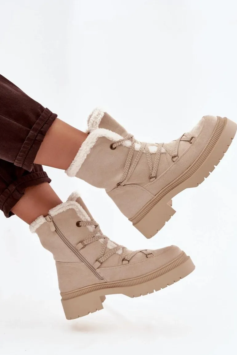 Damskie śniegowce wykonane z eko zamszu to idealna propozycja na zimowe dni. Model zapinany na zamek z dodatkowym wiązaniem zapewnia doskonałe dopasowanie oraz wygodę podczas noszenia. Wnętrze butów zostało ocieplone kocem obuwniczym, który gwarantuje ciepło nawet w mroźne dni. Górną część cholewki ozdobiono miękkim, syntetycznym kożuszkiem, dodającym całości przytulnego i stylowego akcentu. To praktyczne, a zarazem modne śniegowce, które świetnie sprawdzą się zarówno na zimowych spacerach, jak i w codziennych stylizacjach. Przy wyborze rozmiaru prosimy sugerować się tabelą rozmiarów.