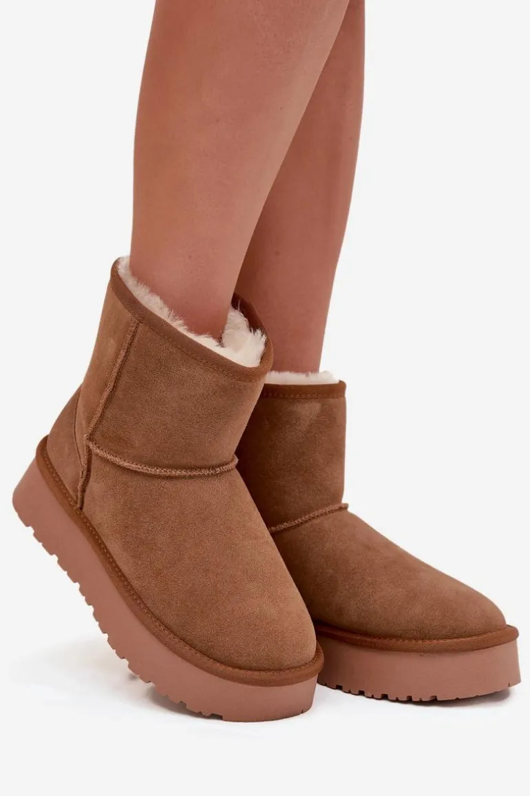 Śniegowce damskie wykonane z naturalnego zamszu. Wnętrze ocieplone miękkim futerkiem gwarantuje komfort i ciepło nawet w mroźne dni. Osadzone na platformie z gumowego tworzywa skutecznie izolują od chłodnego podłoża, zapewniając wygodę podczas codziennego użytkowania. To idealny wybór na zimowe wyjścia – praktyczne, modne i komfortowe. Przy wyborze rozmiaru prosimy sugerować się tabelą rozmiarów.