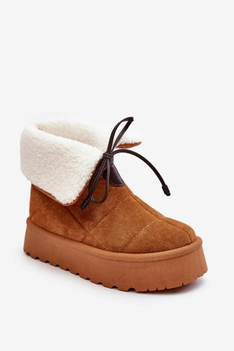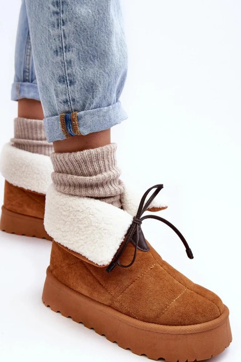 Damskie śniegowce idealnie sprawdzą się podczas mroźnych dni. Wykonane z eko zamszu. Osadzone na grubej platformie. Ocieplone kożuchem. Model wsuwany. Cholewka ozdobiona wiązaniem. Przy wyborze rozmiaru prosimy sugerować się tabelą rozmiarów.