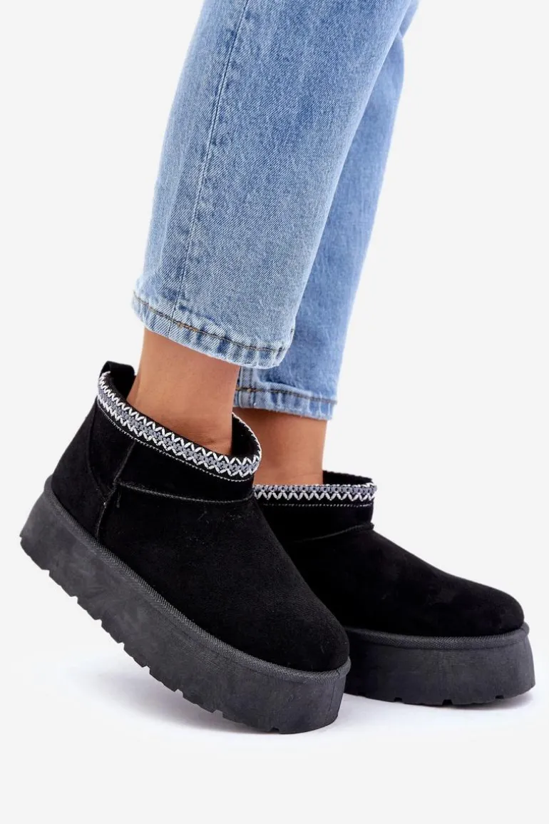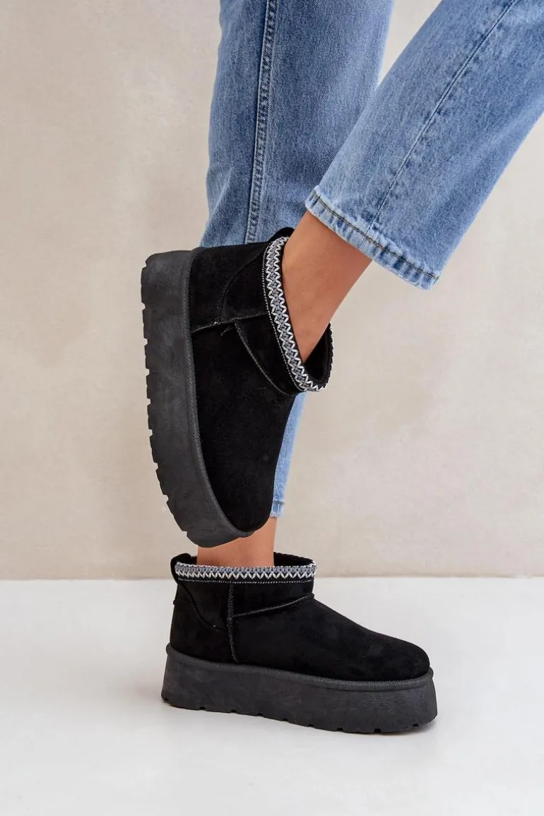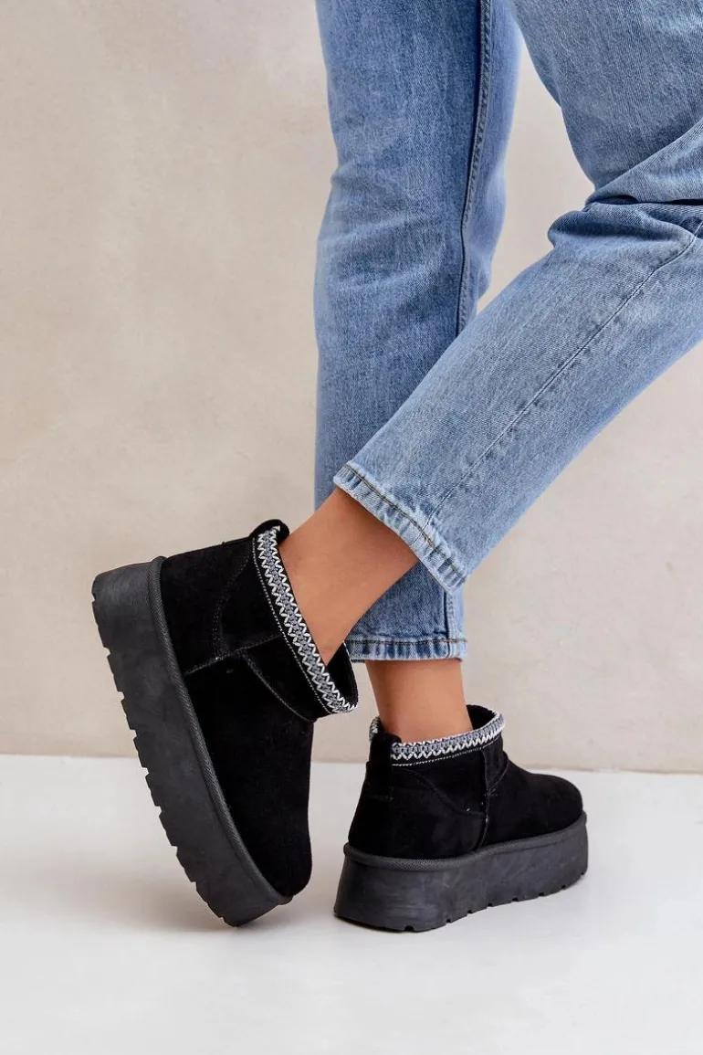 Stylowe śniegowce damskie wykonane z eko zamszu. Osadzone na platformie, która skutecznie izoluje od zimnego podłoża. Wnętrze butów ocieplane miękkim futerkiem, zapewniającym ciepło i komfort w mroźne dni. Górę cholewki zdobi subtelny haft, dodający wyjątkowego uroku. Idealny wybór na zimowe spacery i codzienne aktywności w chłodne dni! Przy wyborze rozmiaru prosimy kierować tabelą rozmiarów.