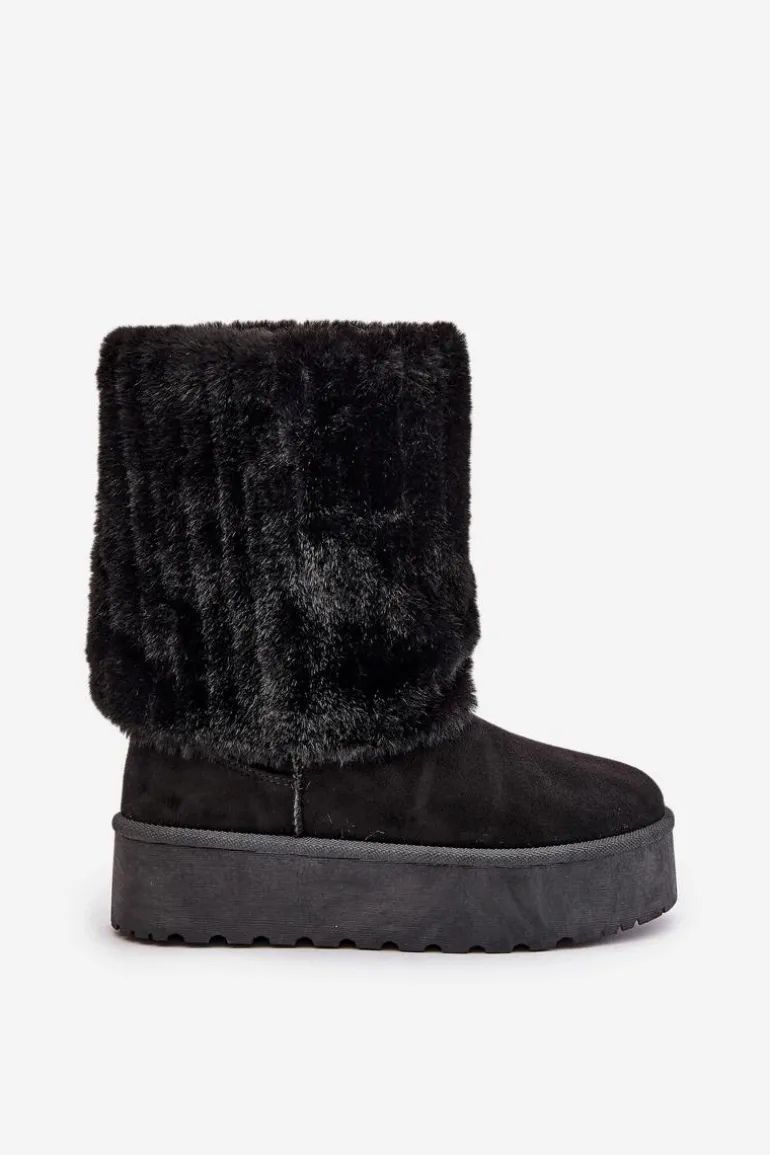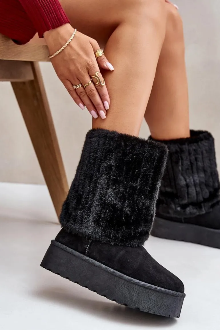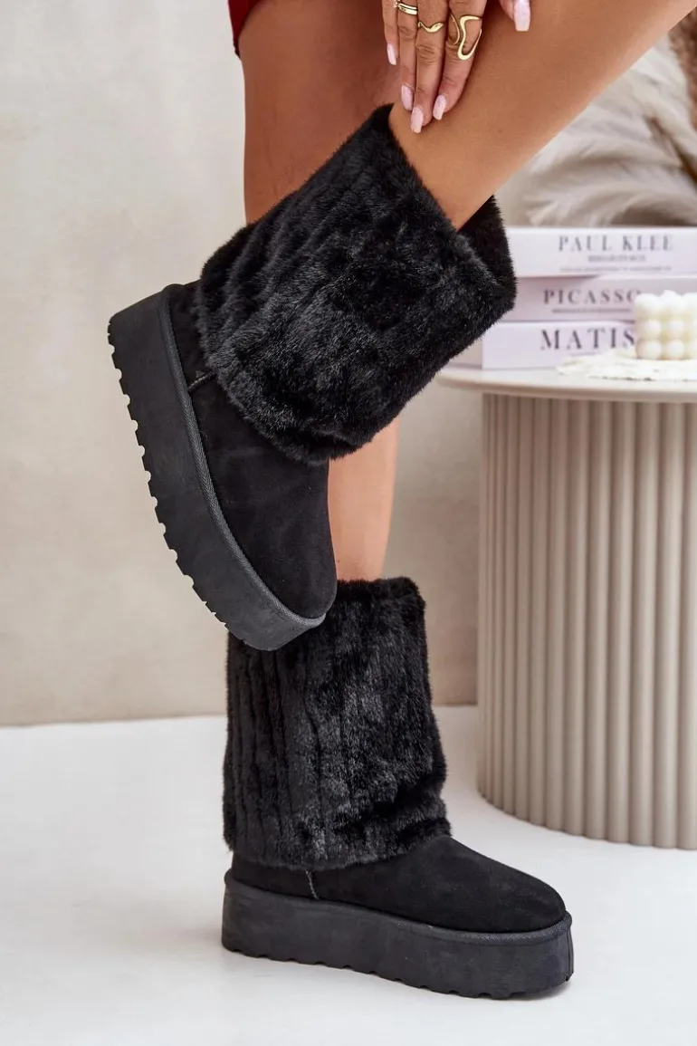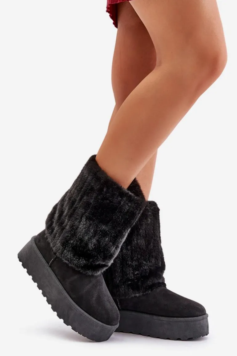 Wysokie śniegowce damskie z wywiniętą cholewką. Wykonane z ekologicznego zamszu. Osadzone na platformie. Wnętrze ocieplane futerkiem gwarantuje ciepło, co sprawia, że są doskonałym wyborem na zimowe dni, skutecznie chroniąc przed chłodem. Stylowy wygląd umożliwia ich łatwe dopasowanie do różnych stylizacji, dodając każdej zimowej stylizacji niepowtarzalny charakter. Przy wyborze rozmiaru prosimy sugerować się tabelą rozmiarów.