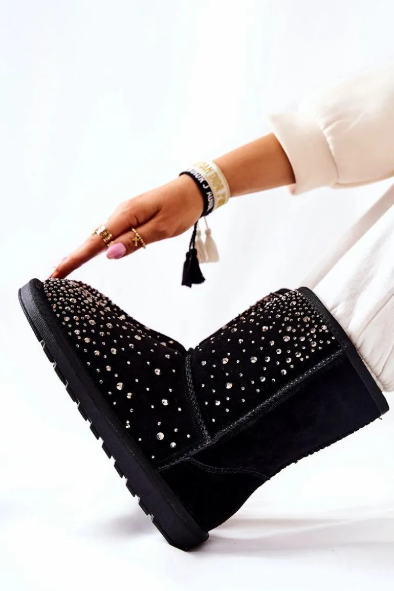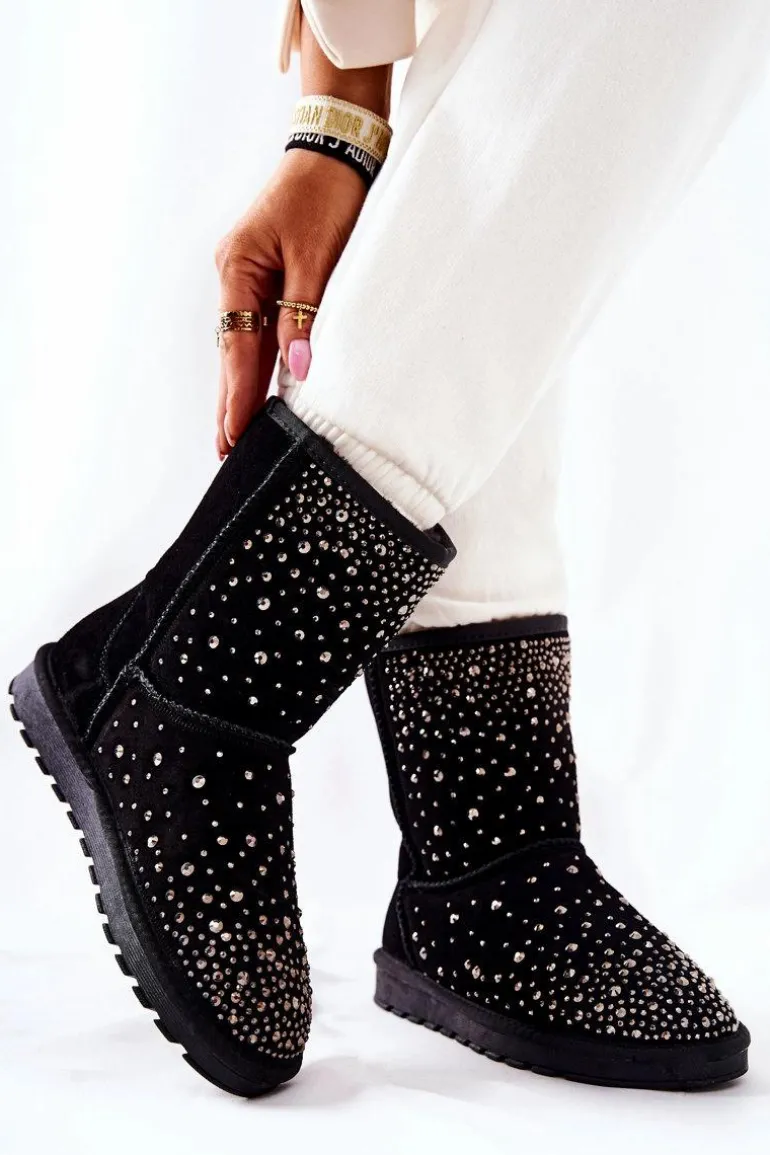 Pięknie zdobione dżetami śniegowce są idealne podczas zimnych dni! W środku posiadają ocieplenie w postaci przyjemnego w dotyku futerka. Zostały wykonane z naturalnego zamszu. Gruba podeszwa ochroni stopy przed zimnem. Koniecznie musisz je mieć, nie czekaj dłużej aż znikną! Przy wyborze rozmiaru, prosimy sugerować się tabelą rozmiarów.