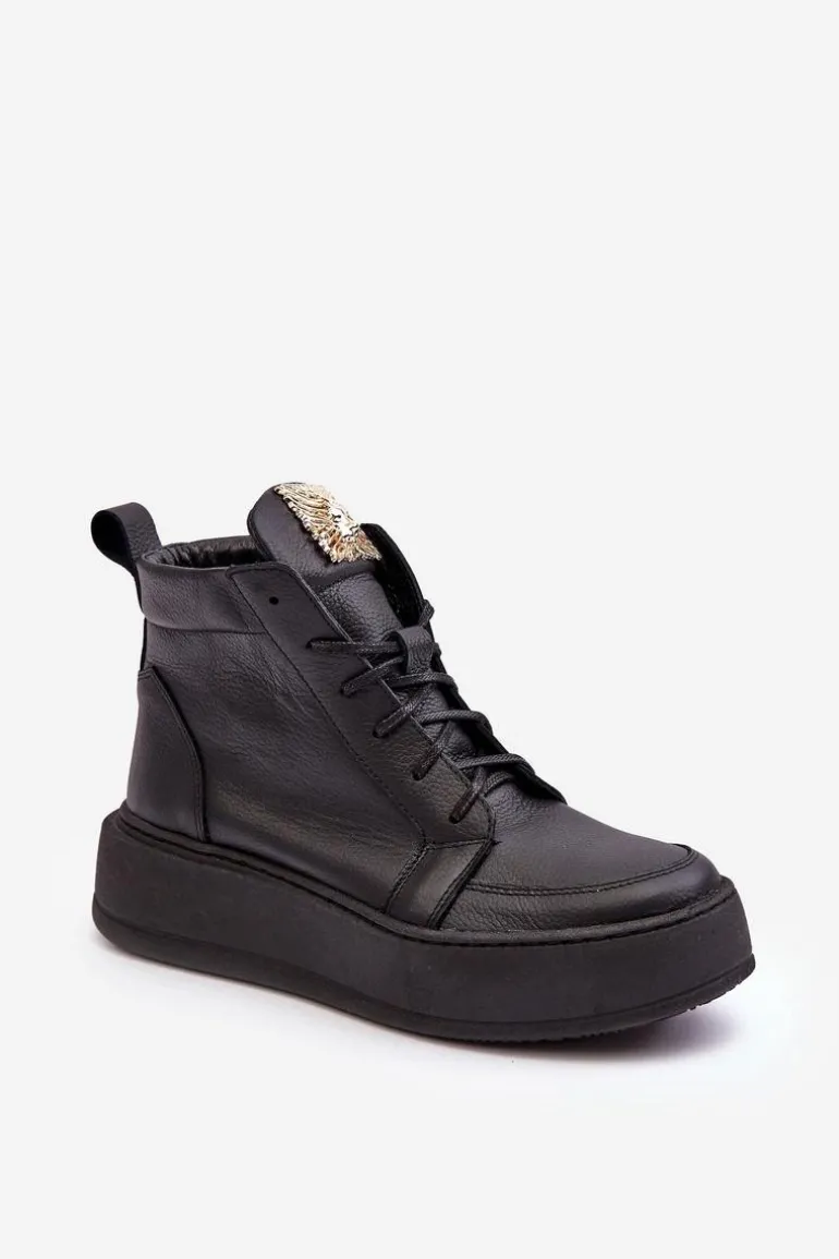 Modne botki damskie zostały wykonane z wysokiej jakości skóry naturalnej. Osadzone na platformie. Model klasycznie sznurowany. Na języku złota ozdoba z tworzywa sztucznego. Noski zaokrąglone. Zapiętek usztywniony. Miękka, skórzana wkładka zapewni Ci wysoki komfort użytkowania przez cały dzień! Koniecznie powinnaś je mieć! Przy wyborze rozmiaru prosimy sugerować się tabelą rozmiarów.