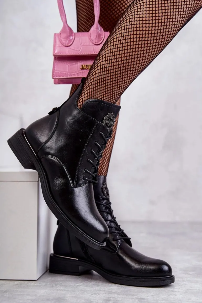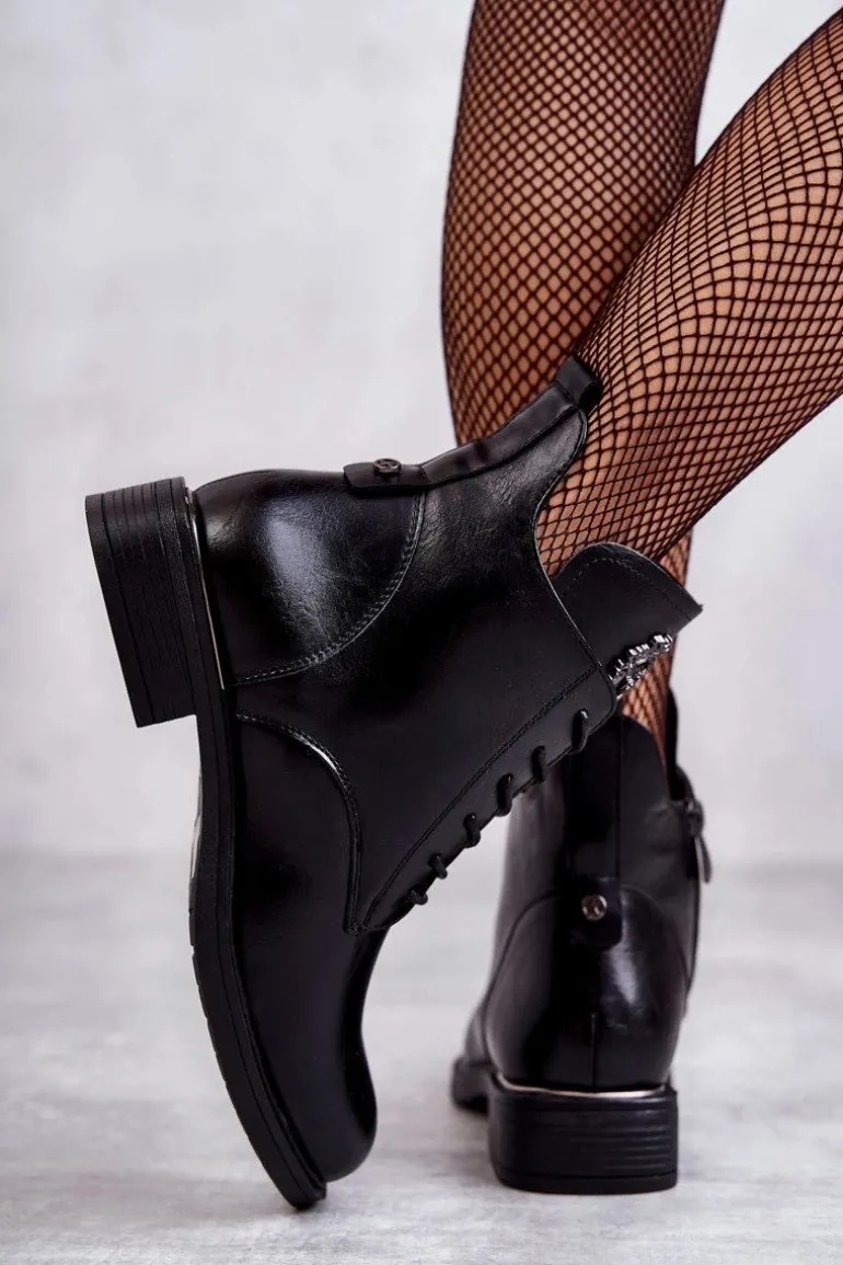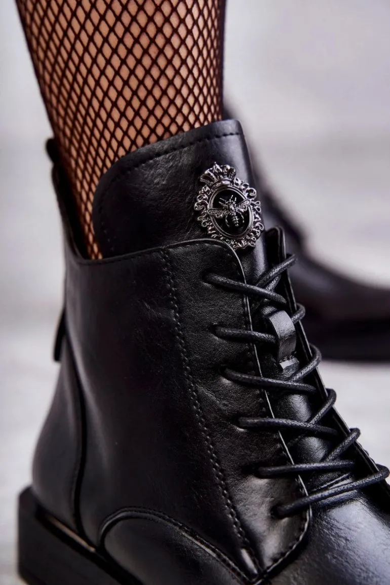 Botki damskie z cholewką wykonaną z eko skóry. Botki na języku zostały przyozdobione elementem z tworzywa sztucznego, który nadaje im niepowtarzalny wygląd. Model klasycznie sznurowany. Buty te zostały osadzone na płaskim obcasie. Środek ocieplony kocem obuwniczym sprawi, że chłodne dni nie będą już takie straszne! Ten model powinien być Twój! Przy wyborze rozmiaru prosimy sugerować się tabelą rozmiarów.