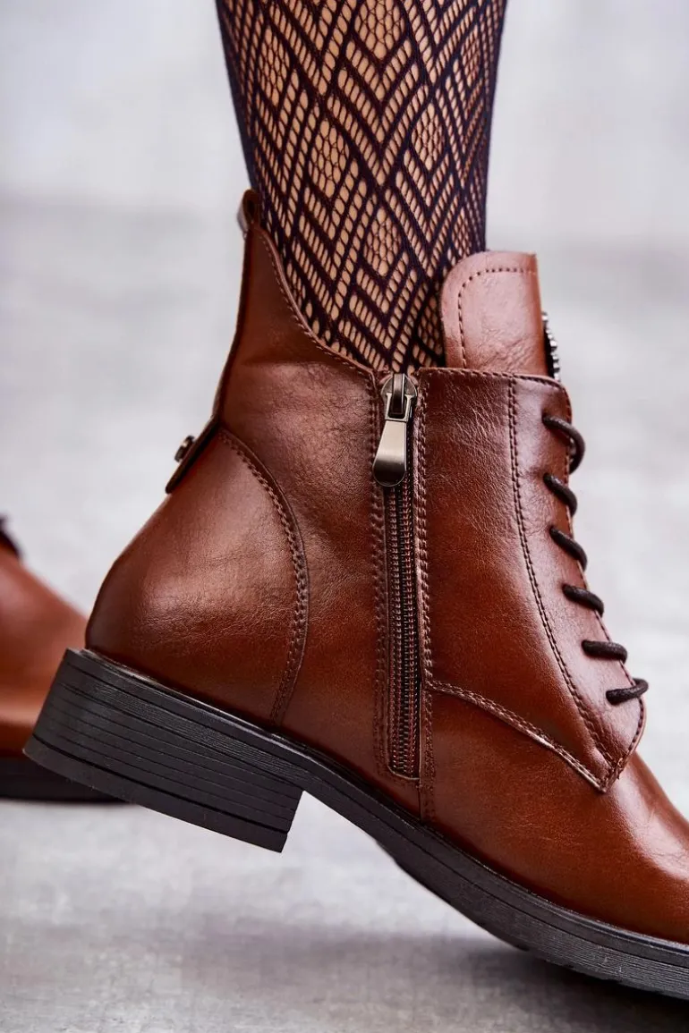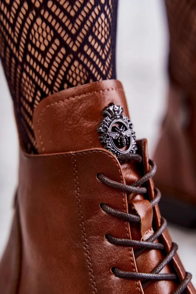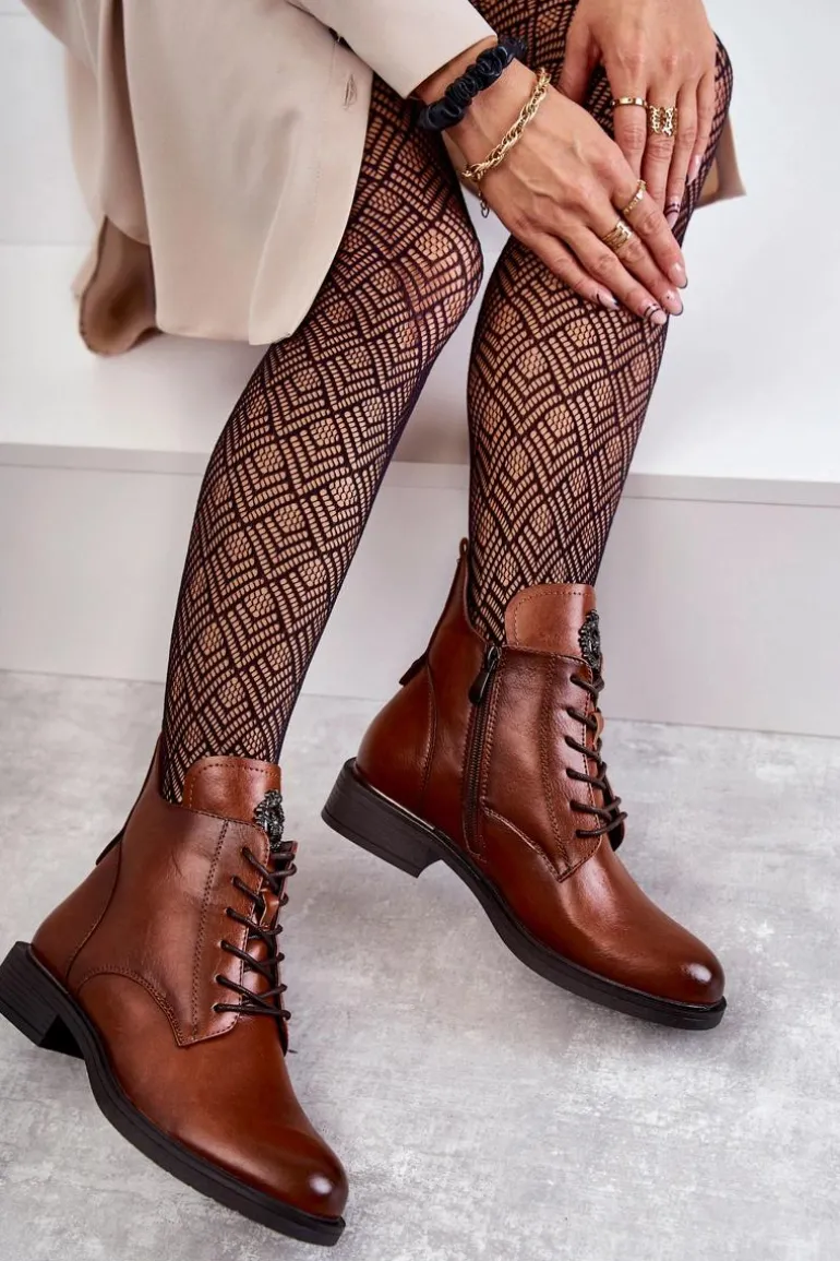 Botki damskie z cholewką wykonaną z eko skóry. Botki na języku zostały przyozdobione elementem z tworzywa sztucznego, który nadaje im niepowtarzalny wygląd. Model klasycznie sznurowany. Buty te zostały osadzone na płaskim obcasie. Środek ocieplony kocem obuwniczym sprawi, że chłodne dni nie będą już takie straszne! Ten model powinien być Twój! Przy wyborze rozmiaru prosimy sugerować się tabelą rozmiarów.