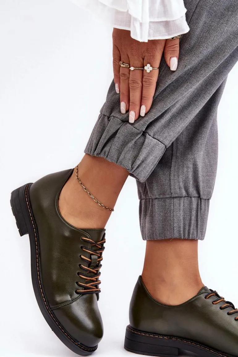Modne półbuty damskie wykonane z eko skóry. Osadzone na płaskim, stabilnym obcasie. Noski zaokrąglone. Zapiętek jest usztywniony. Wkładka ze skóry naturalnej zapewni komfort podczas użytkowania obuwia. Model klasycznie sznurowany. Buty te sprawdzą się w wielu jesiennych stylizacjach! Koniecznie sprawdź całą naszą kolekcję półbutów! Przy wyborze rozmiaru prosimy sugerować się tabelą rozmiarów.
