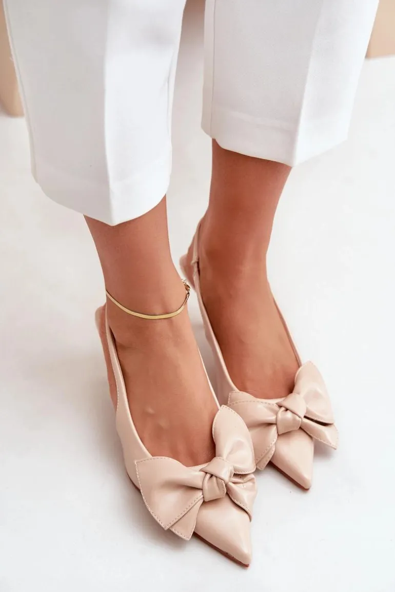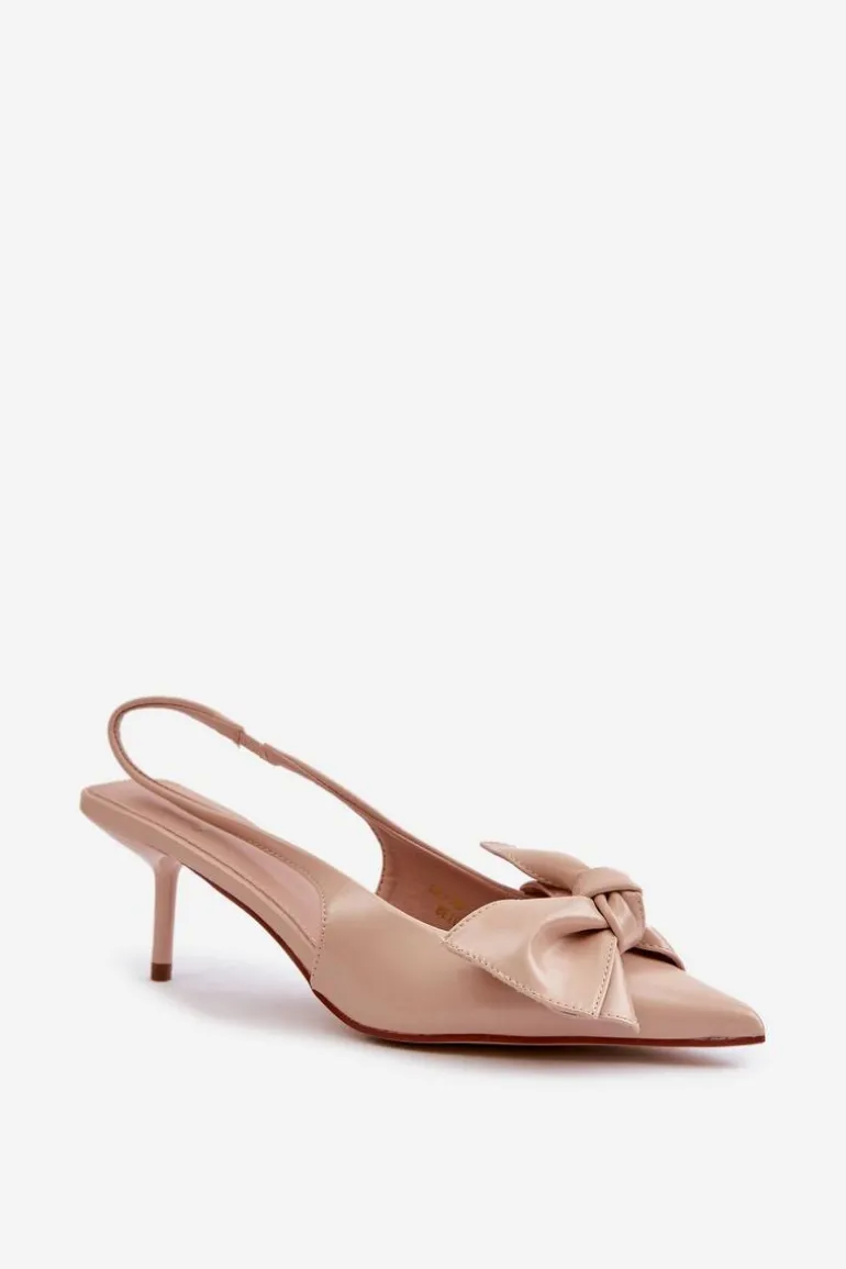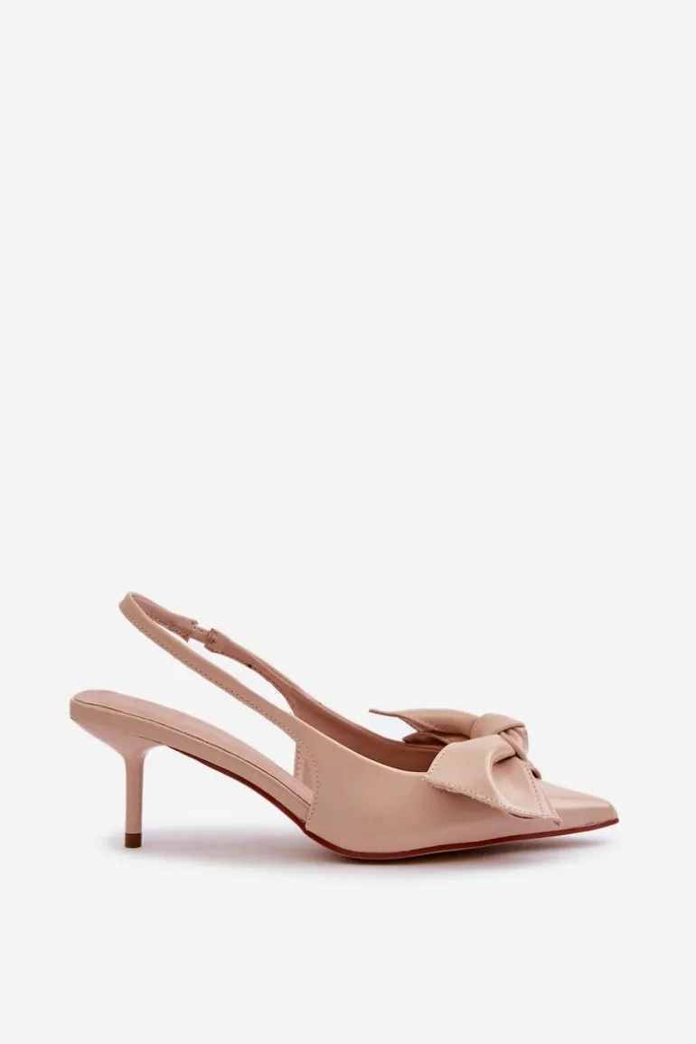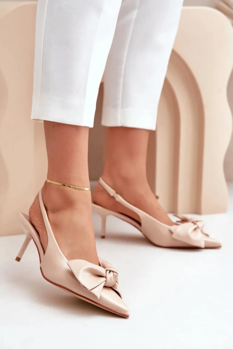 Eleganckie damskie szpilki z eko skóry. Ten model charakteryzuje się spiczastymi noskami. Przód buta urozmaica efektowna kokarda, która podkreśla unikalny charakter szpilek. Doskonałe do wieczorowych stylizacji! Przy wyborze rozmiaru prosimy sugerować się tabelą rozmiarów.