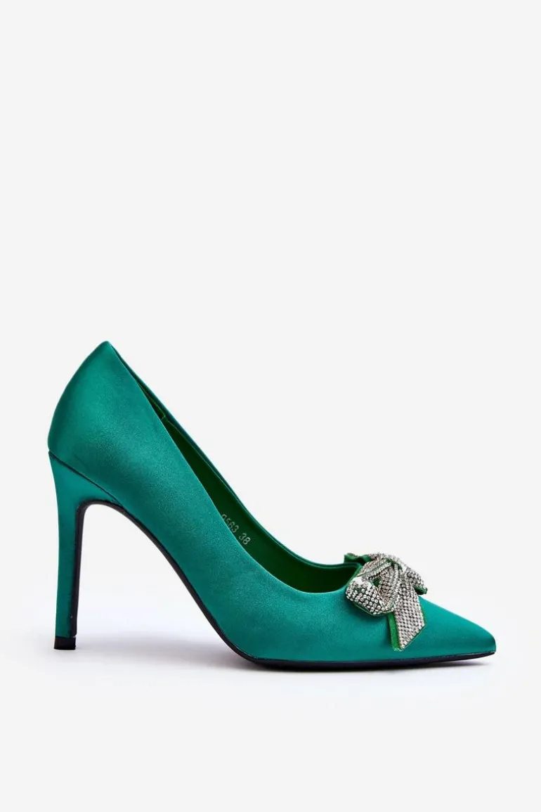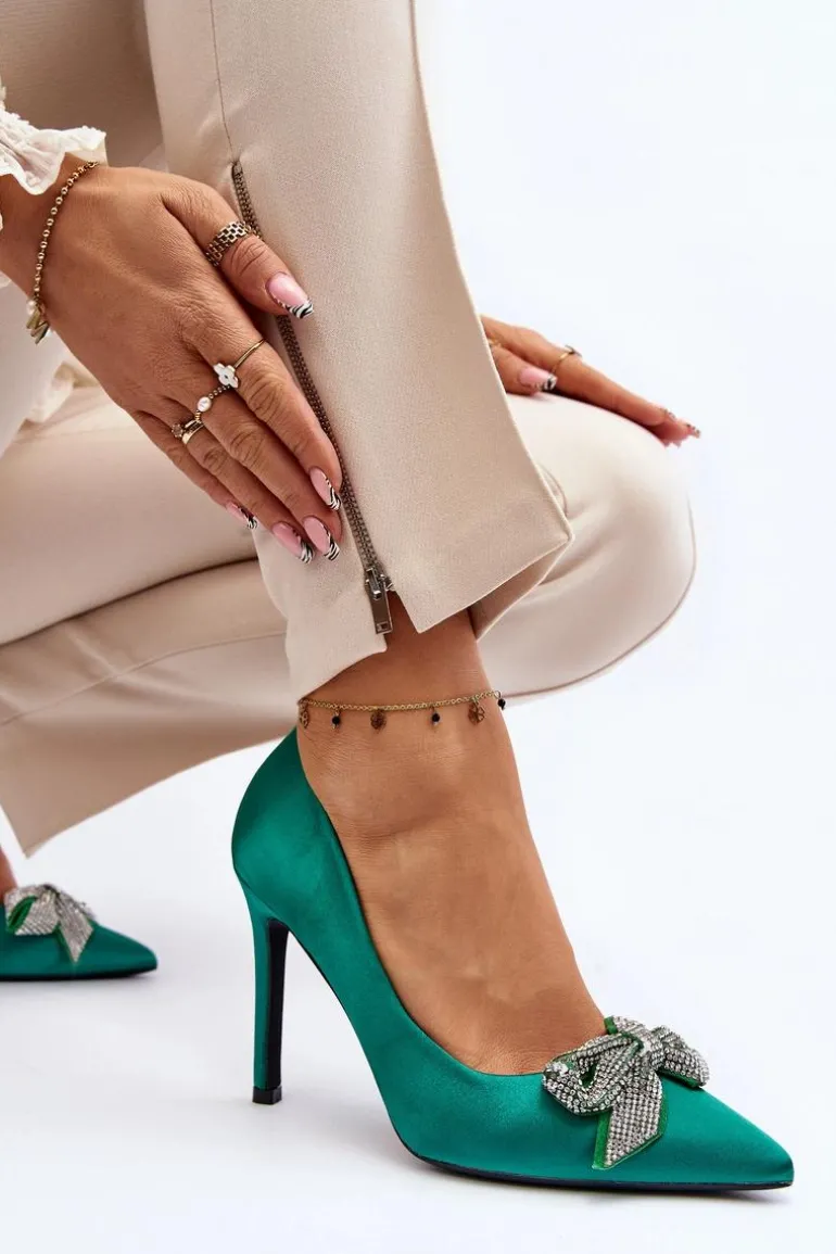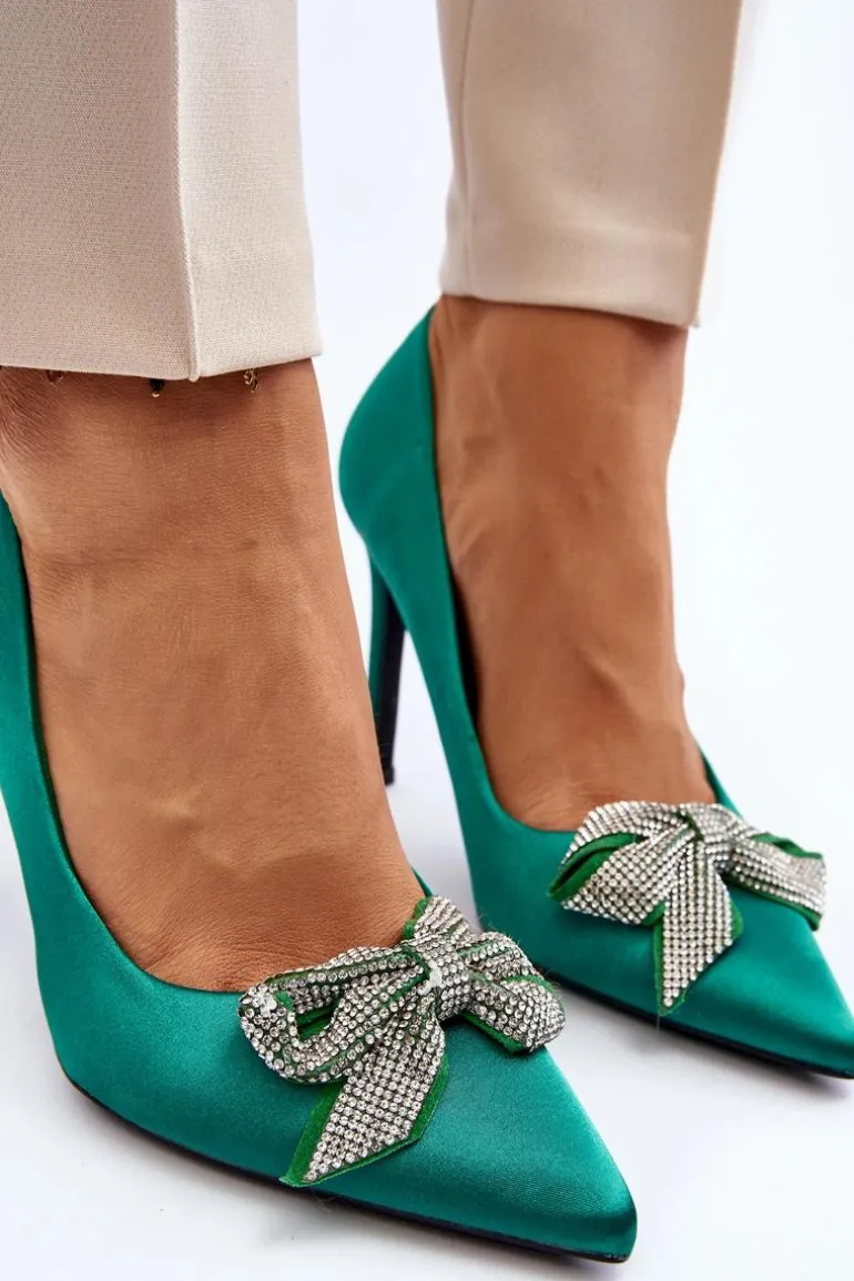 Eleganckie szpilki zostały wykonane z materiału tekstylnego imitującego satynę. Na przodzie znajduje się ozdobna kokarda z mieniącymi się dżetami. Noski w szpic optycznie wysmuklą nogi. Miękka wkładka z eko skóry zapewni wygodę podczas użytkowania. Ten model doda uroku Twoim stylizacjom! Przy wyborze rozmiaru prosimy sugerować się tabelą rozmiarów.