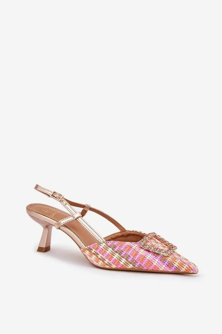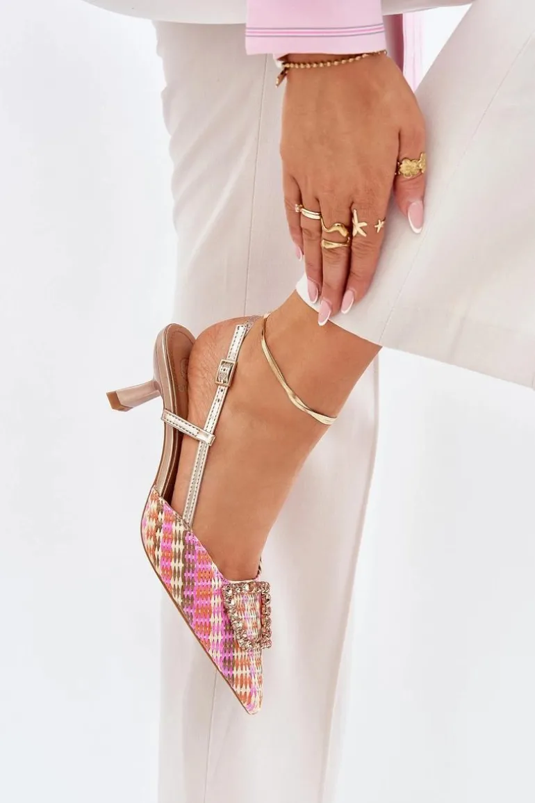 Szpilki damskie z odkrytą piętą, które zachwycają swoim wyglądem. Model z noskami w szpic optycznie wydłuża nogi, a ozdoba z przodu dodaje im wyjątkowego uroku. Zapinane na regulowany pasek ze sprzączką, zapewniają wygodę i doskonałe dopasowanie. Idealny wybór na wieczorne wyjścia i wyjątkowe okazje. Przy wyborze rozmiaru prosimy sugerować się tabelą rozmiarów.