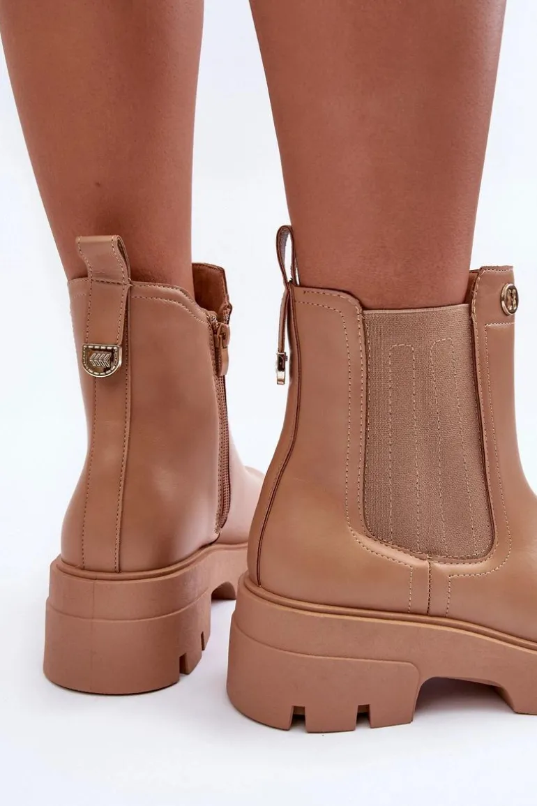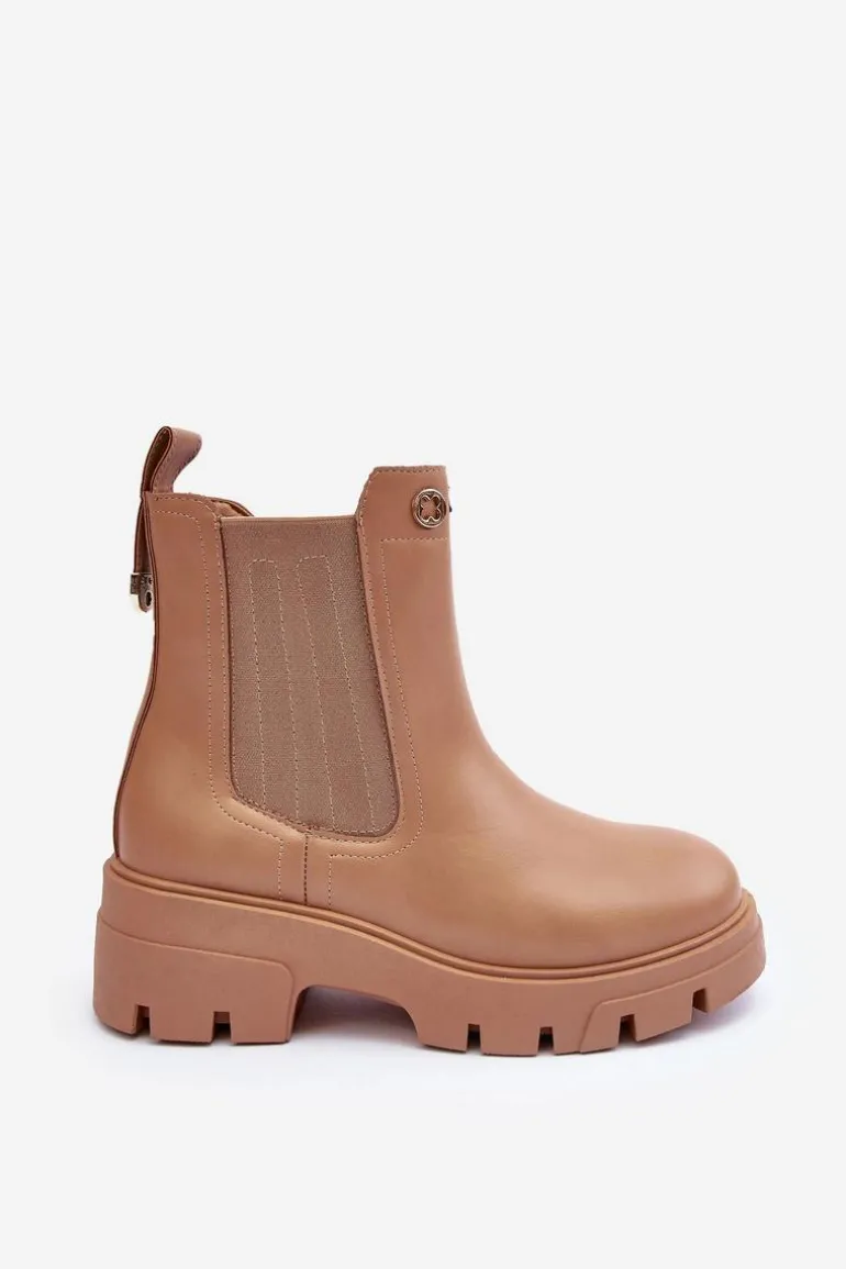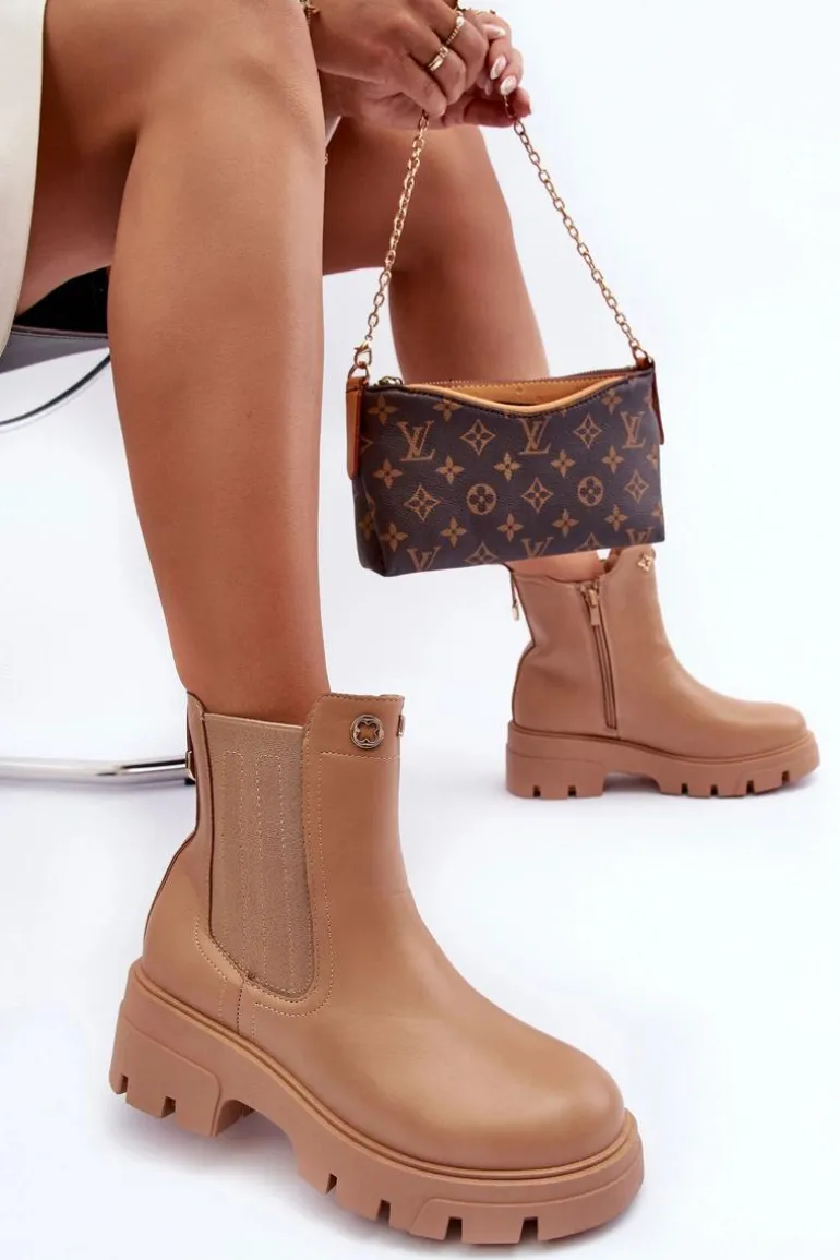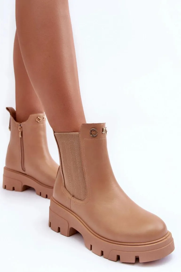 Klasyczne damskie botki osadzone na masywnym, płaskim obcasie oraz platformie. Wykonane z eko skóry. Wnętrze ocieplone kocem obuwniczym. Model zapinany na suwak. Na górze cholewki małe, złote ozdoby z tworzywa sztucznego. Koniecznie powinnaś mieć ten model w swojej szafie! Przy wyborze rozmiaru prosimy sugerować się tabelą rozmiarów.