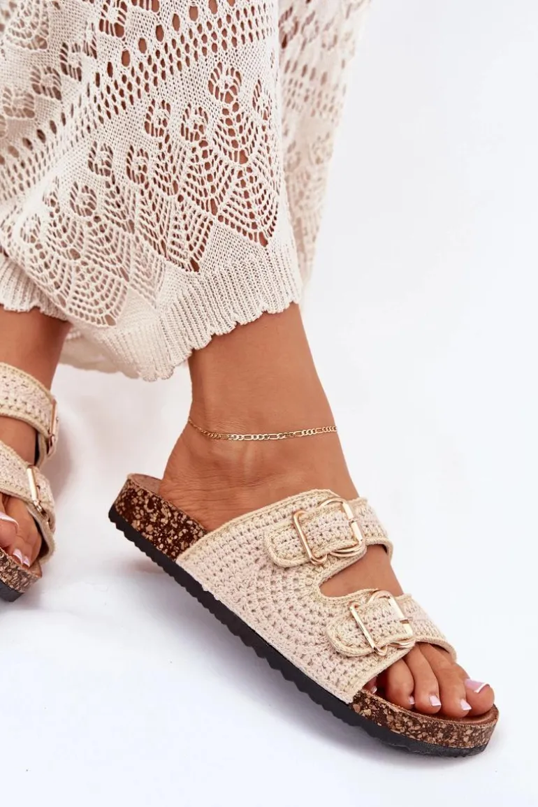 Szydełkowe Klapki Damskie Ze Złotymi Klamrami Beżowe Fenira