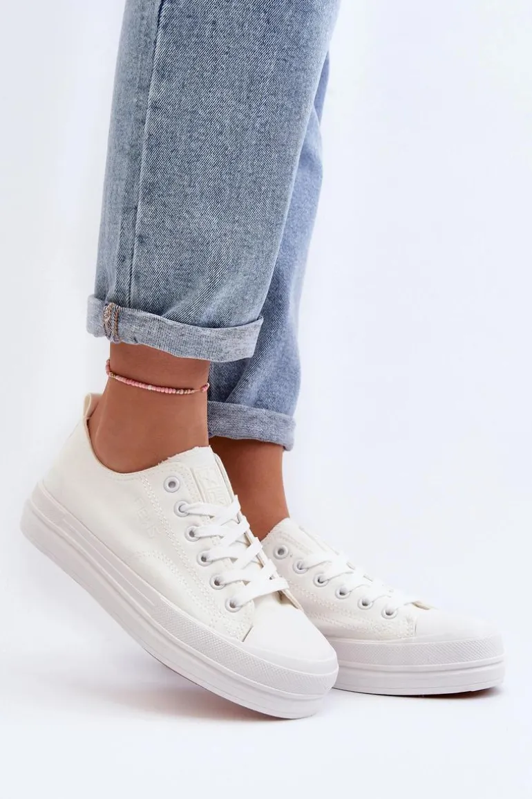 Trampki damskie wykonane z materiału tekstylnego. Osadzone na platformie. Gumowa podeszwa jest antypoślizgowa. Ponadczasowy model, który powinnaś mieć w swojej szafie! Z pewnością założysz je do wielu stylizacji! Nosek został wzmocniony gumowym tworzywem. Przy wyborze rozmiaru prosimy sugerować się tabelą rozmiarów.