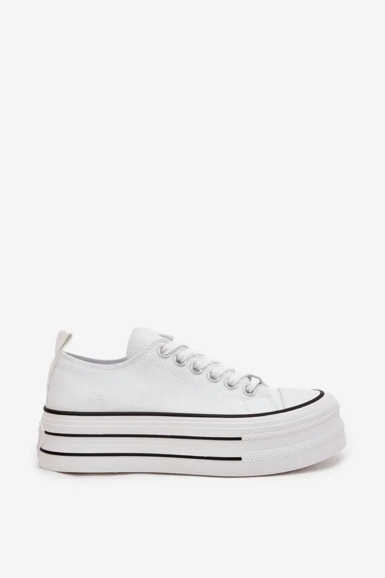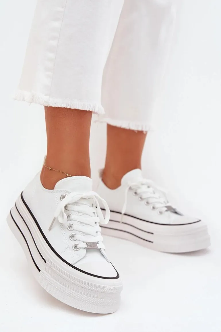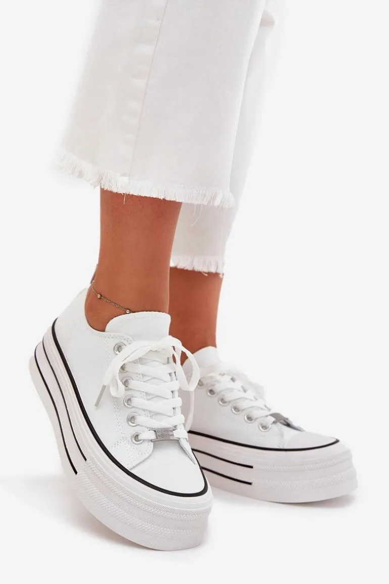 Trampki damskie wykonane z materiału tekstylnego, osadzone na masywnej platformie, która optycznie wysmukla sylwetkę. Niska cholewka i klasyczne sznurowanie zapewniają wygodę oraz idealne dopasowanie. Stylowy fason sprawia, że te trampki doskonale komponują się z codziennymi stylizacjami. Przy wyborze rozmiaru prosimy sugerować się tabelą rozmiarów.
