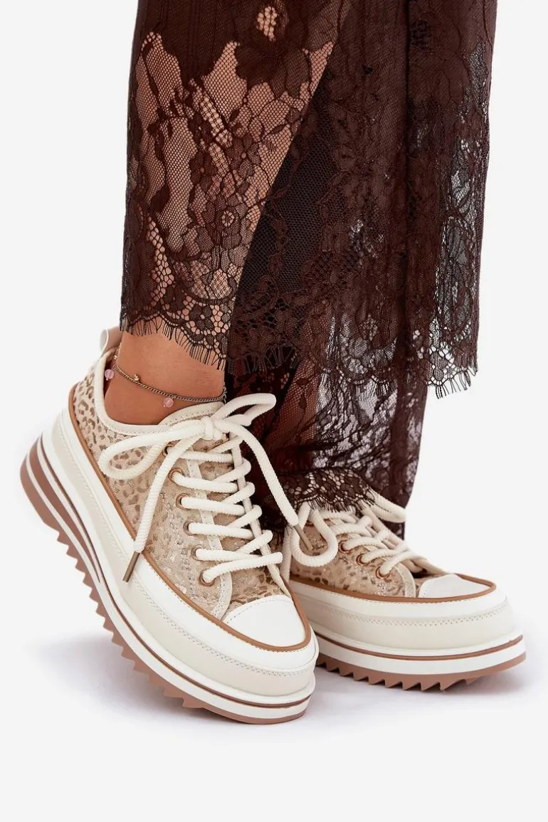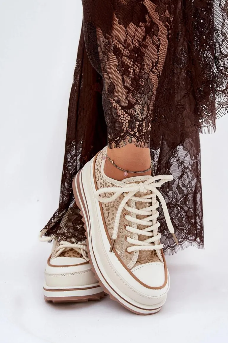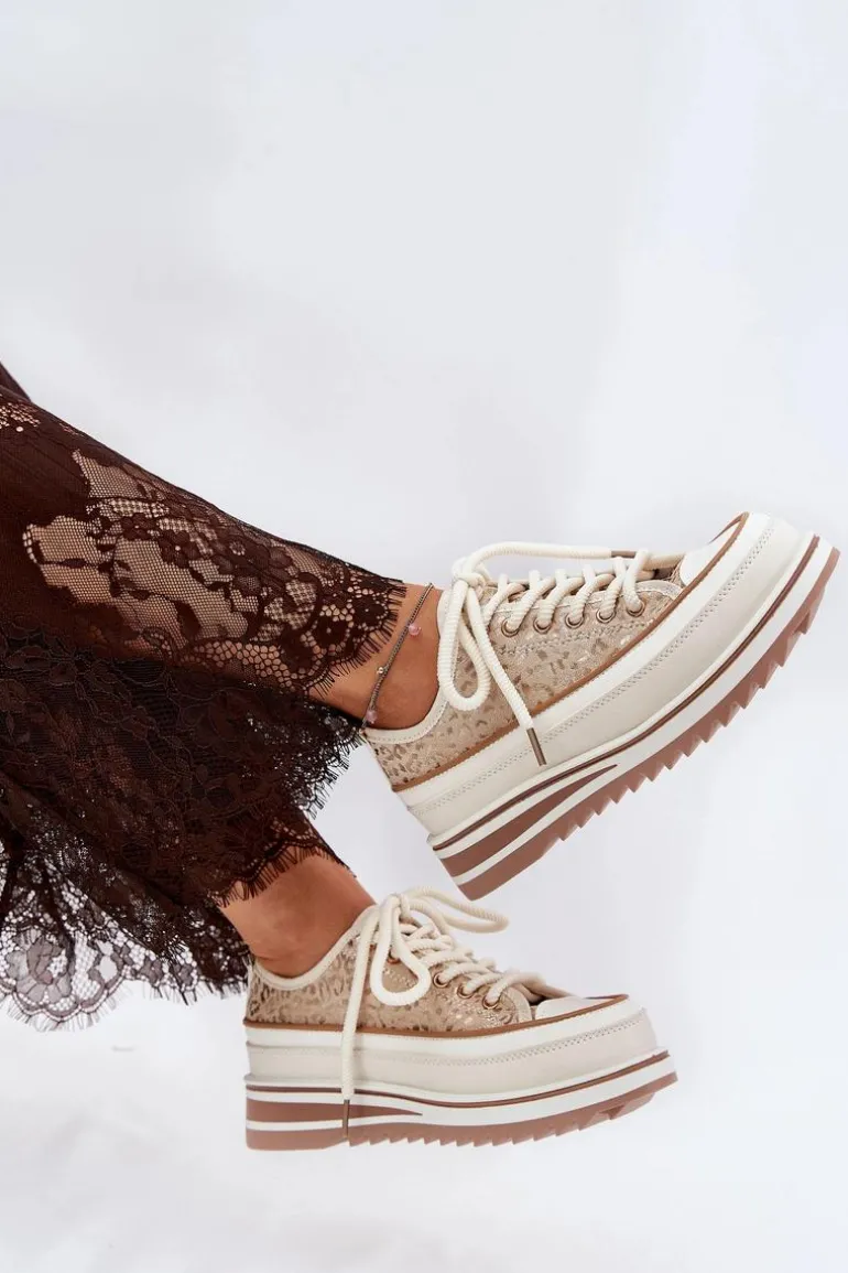 Trampki damskie wykonane z materiału tekstylnego. Osadzone na masywnej platformie, która wysmukli sylwetkę. Model z grubszym sznurowaniem, co dodaje im wyjątkowego charakteru. Miękka wkładka zapewnia komfort i amortyzację na każdym kroku. Doskonałe do codziennych stylizacji, te trampki oferują zarówno styl, jak i funkcjonalność. Przy wyborze rozmiaru prosimy sugerować się tabelą rozmiarów.