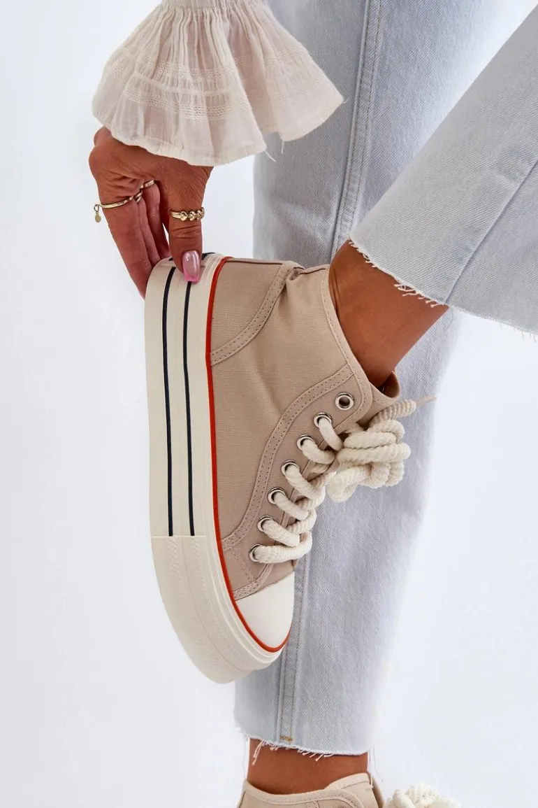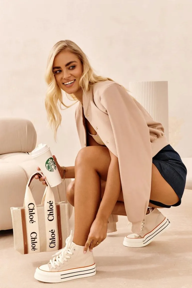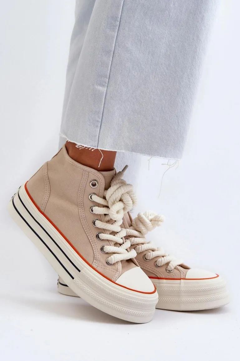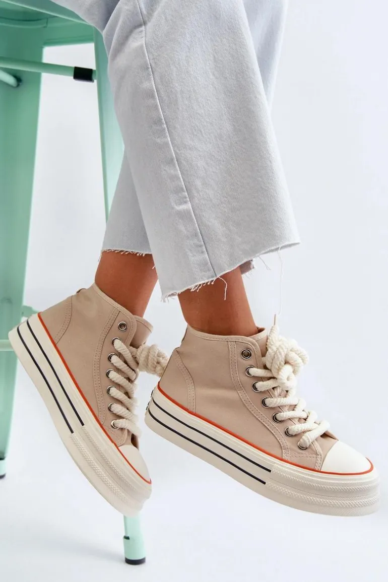 Trampki damskie wykonane z materiału tekstylnego. Masywna platforma z gumowego tworzywa dodaje im modnego wyglądu oraz zapewnia stabilność podczas chodzenia. Zaokrąglone noski oraz klasyczne sznurowanie sprawiają, że są uniwersalnym dodatkiem do wielu casualowych stylizacji. Niezależnie od tego, czy idziesz na spacer po mieście czy spotkanie ze znajomymi, te trampki będą doskonałym wyborem. Przy wyborze rozmiaru prosimy sugerować się tabelą rozmiarów.