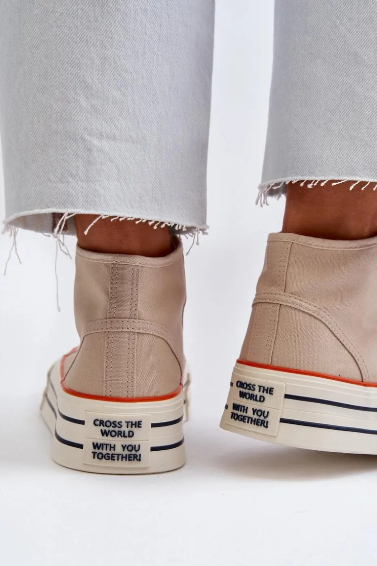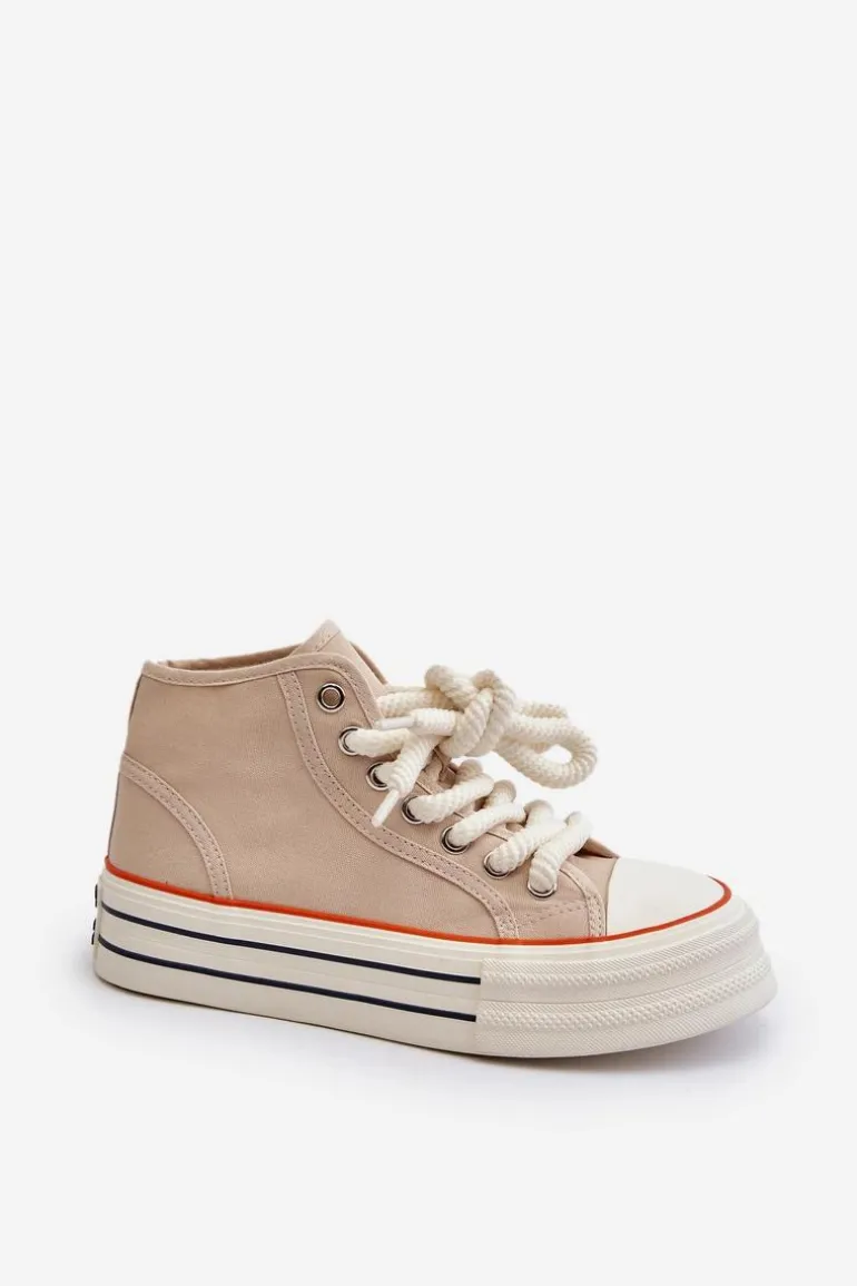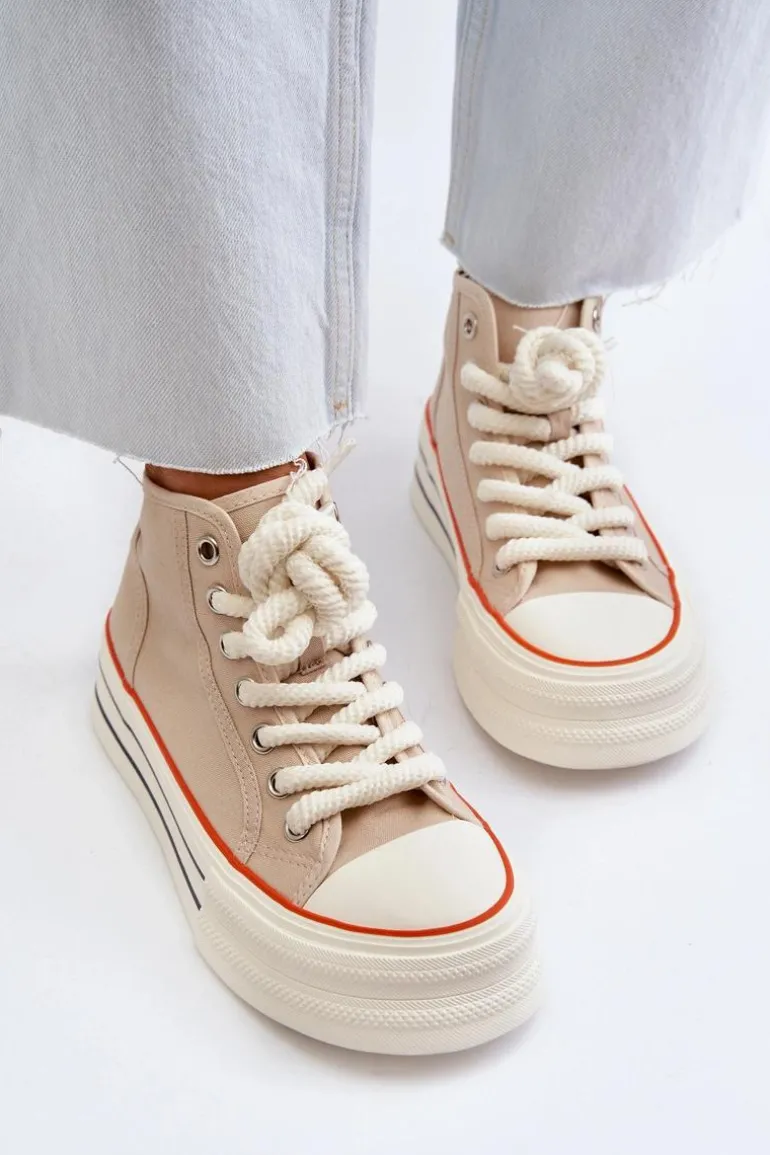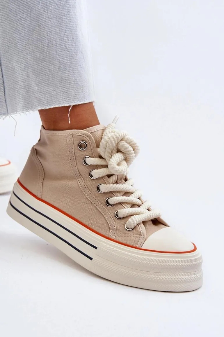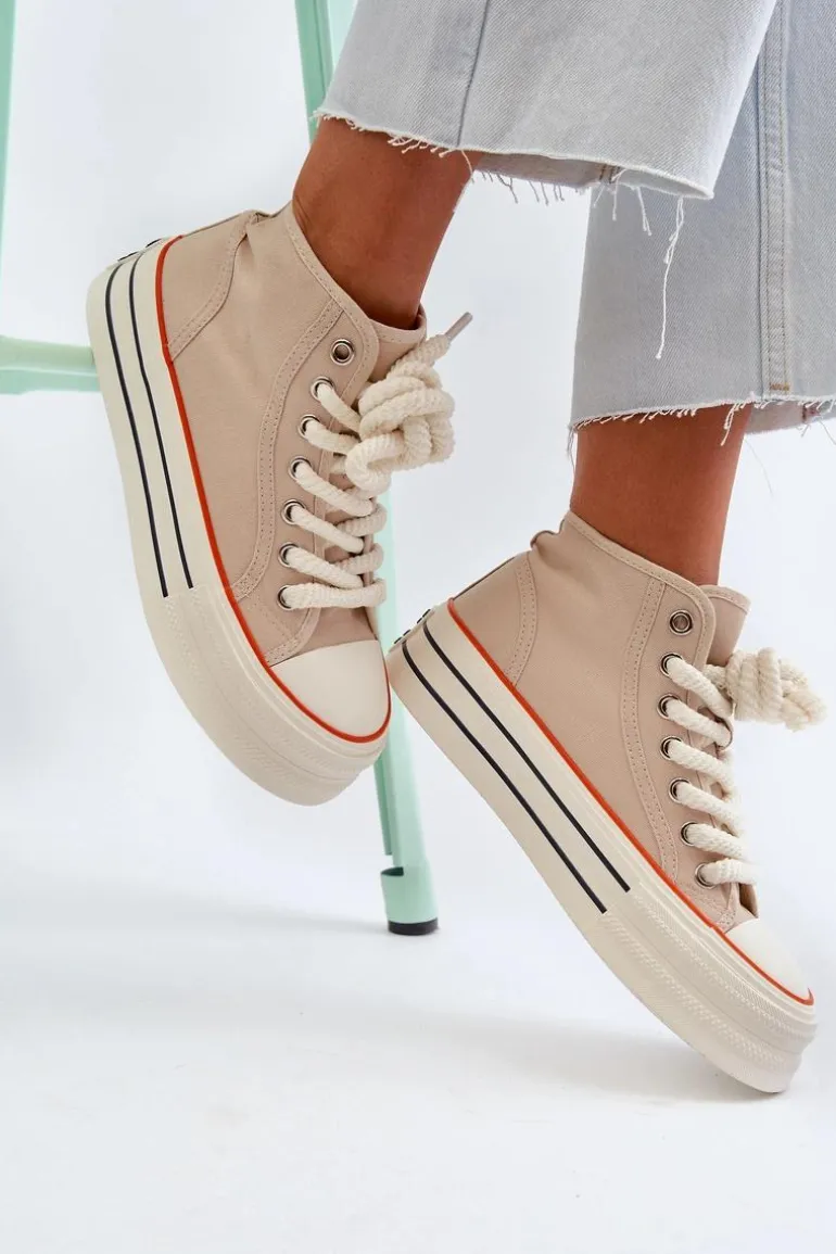 Trampki damskie wykonane z materiału tekstylnego. Masywna platforma z gumowego tworzywa dodaje im modnego wyglądu oraz zapewnia stabilność podczas chodzenia. Zaokrąglone noski oraz klasyczne sznurowanie sprawiają, że są uniwersalnym dodatkiem do wielu casualowych stylizacji. Niezależnie od tego, czy idziesz na spacer po mieście czy spotkanie ze znajomymi, te trampki będą doskonałym wyborem. Przy wyborze rozmiaru prosimy sugerować się tabelą rozmiarów.
