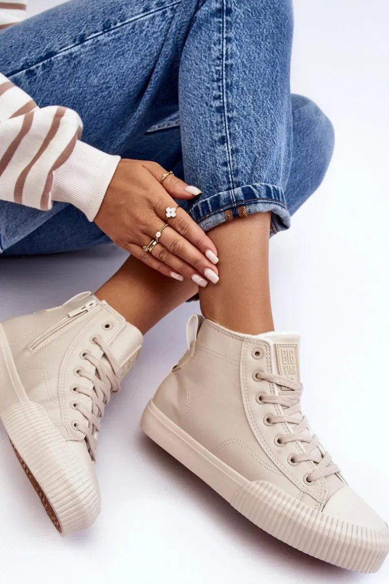 Damskie trampki od marki BIG STAR z cholewką za kostkę. Wykonane z eko skóry. Model zapinany na suwak oraz dodatkowo posiada sznurowanie. Z tyłu posiadają ozdobne logo marki. Osadzone na podeszwie z gumowego tworzywa. Środek ocieplony futerkiem. Koniecznie sprawdź całą naszą kolekcję butów marki BIG STAR. Przy wyborze rozmiaru prosimy sugerować się tabelą rozmiarów.