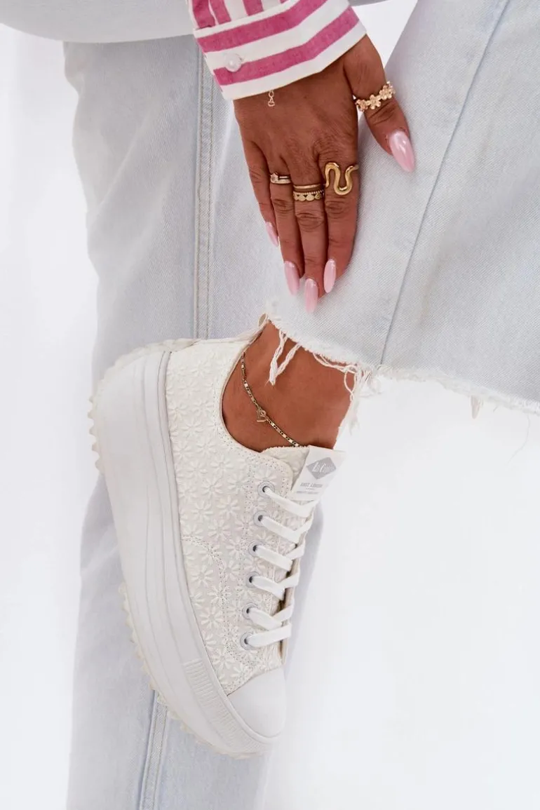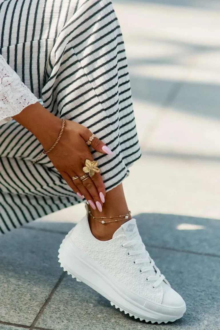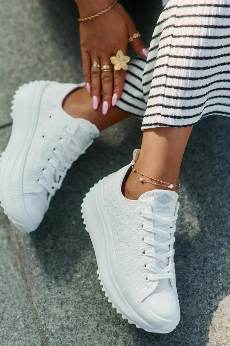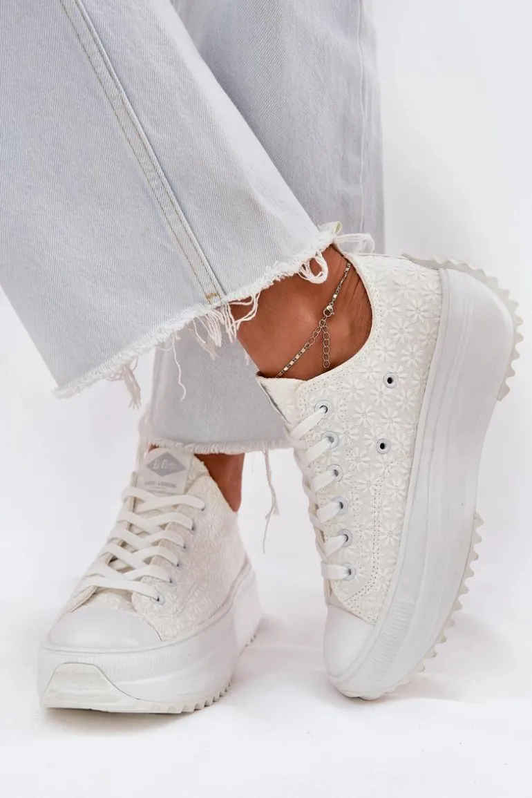 Damskie trampki od marki Lee Cooper to połączenie stylu i wygody. Osadzone na masywnej platformie, zapewniają stabilność oraz lekkość przez cały dzień. Cholewka ozdobiona subtelnym haftem nadaje im wyjątkowego charakteru, a klasyczne sznurowanie umożliwia idealne dopasowanie do stopy. Zaokrąglone noski gwarantują komfort przy każdym kroku. Te trampki doskonale pasują do casualowych oraz tych bardziej eleganckich stylizacji, dodając im modnego i oryginalnego akcentu. Przy wyborze rozmiaru prosimy sugerować się poniższą tabelą rozmiarów.