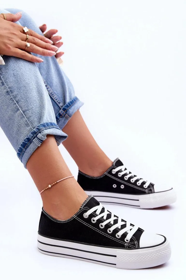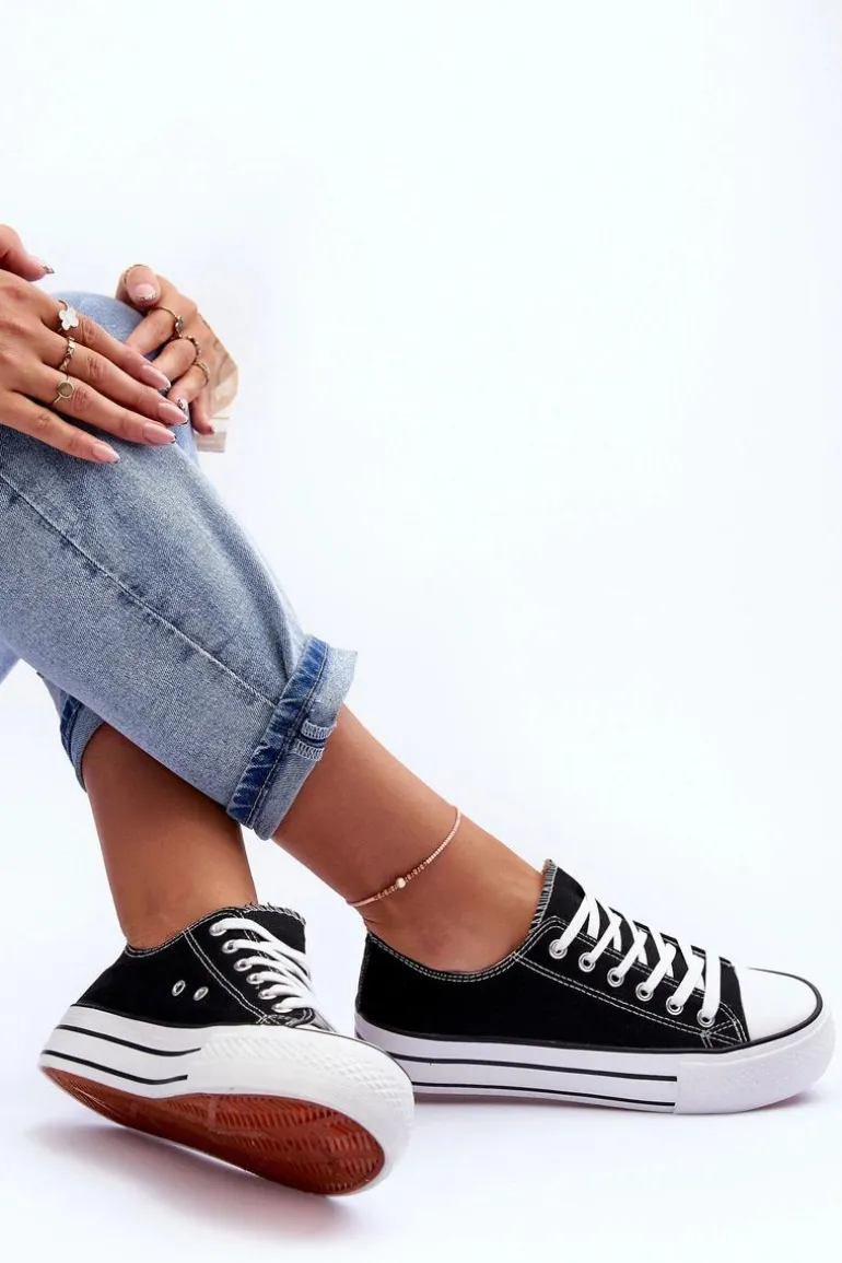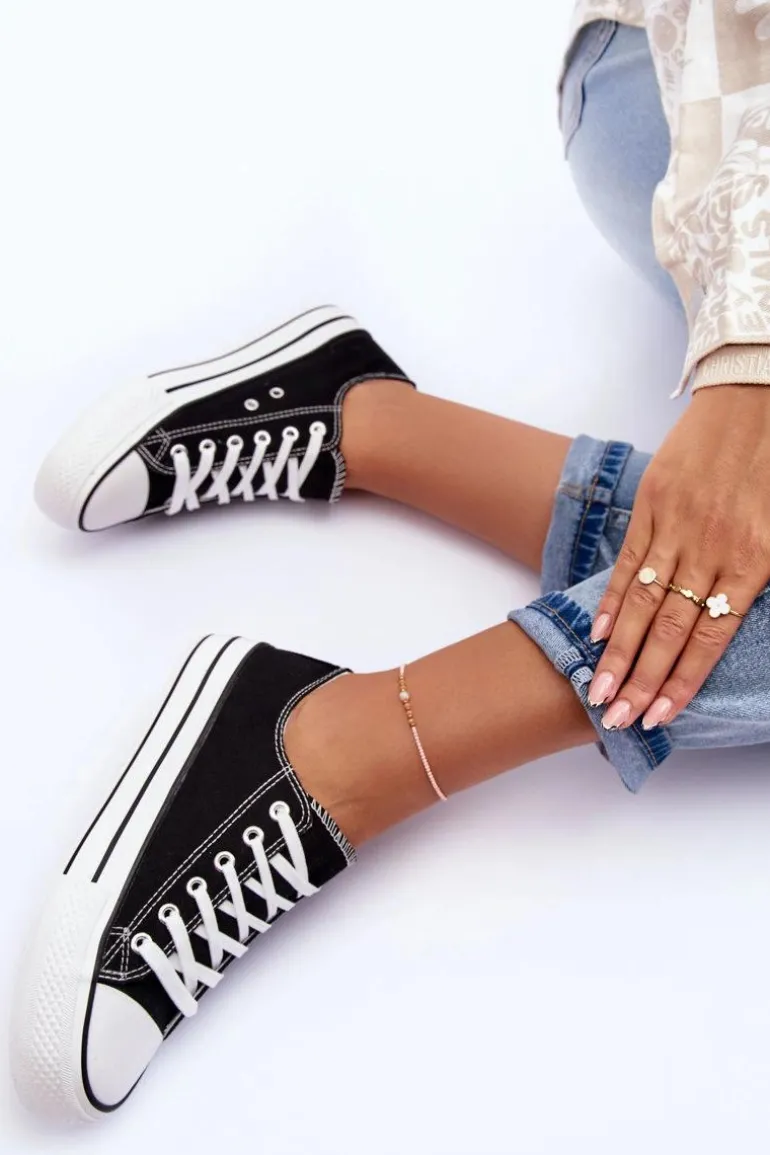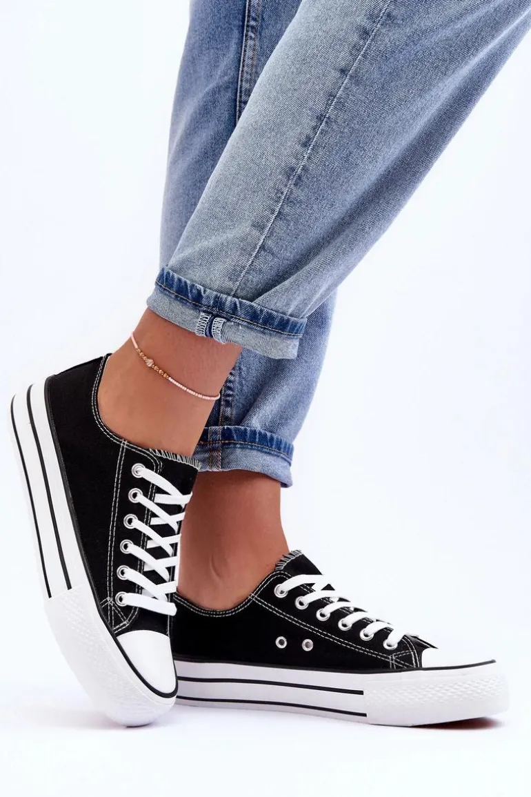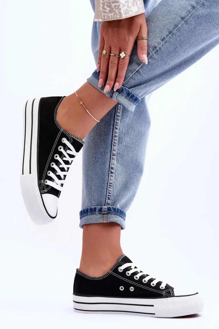 Klasyczne, sznurowane trampki damskie zostały wykonane z materiału tekstylnego. Osadzone na masywnej platformie. Gumowa podeszwa jest antypoślizgowa. Ponadczasowy model, który powinnaś mieć w swojej szafie! Z pewnością założysz je do wielu stylizacji! Nosek został wzmocniony gumowym tworzywem. Przy wyborze rozmiaru prosimy sugerować się tabelą rozmiarów.