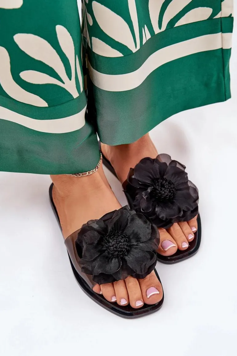 Stylowe klapki damskie o transparentnej cholewce, które wyróżniają się lekkością i nowoczesnym wyglądem. Osadzone na płaskiej podeszwie, zapewniają wygodę na co dzień. Z przodu buty zdobi uroczy sztuczny kwiatek, który dodaje im subtelnej kobiecości i świeżości. Idealne na letnie dni, doskonale komponują się z lekkimi sukienkami, spódnicami lub szortami, wprowadzając odrobinę elegancji i świeżości do każdej stylizacji. Przy wyborze rozmiaru prosimy sugerować się tabelą rozmiarów.