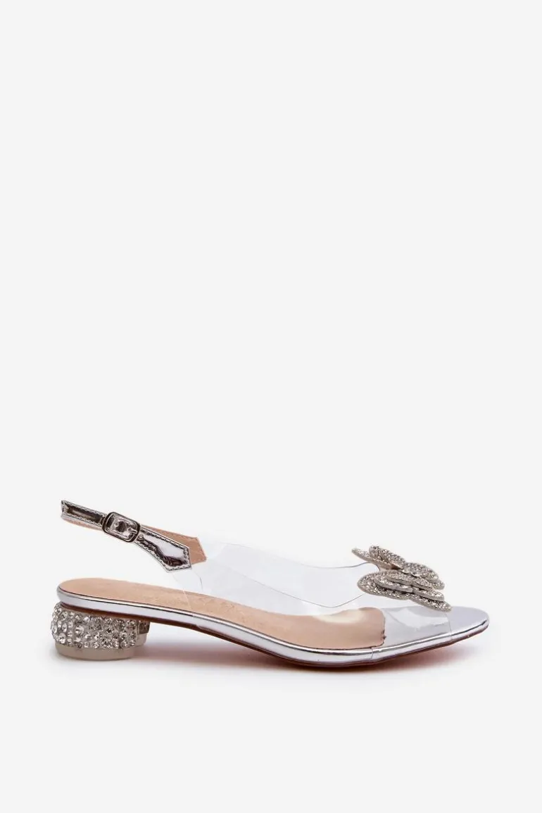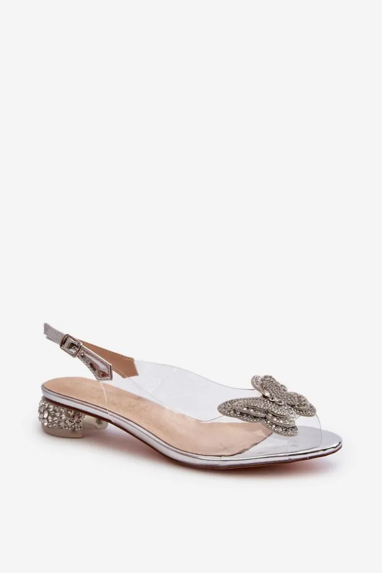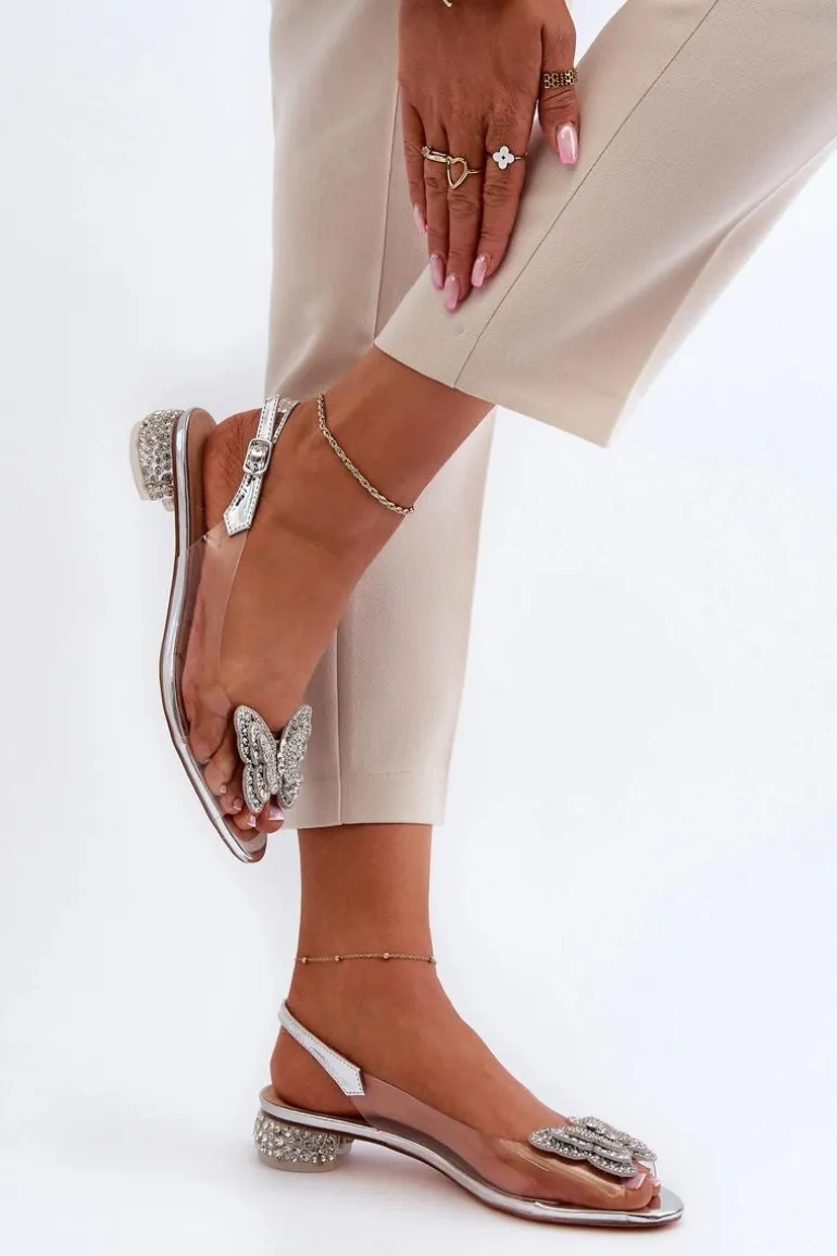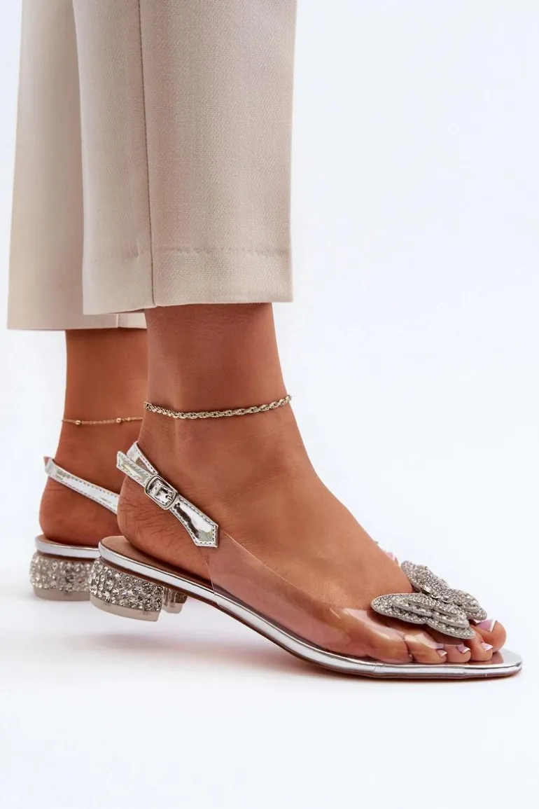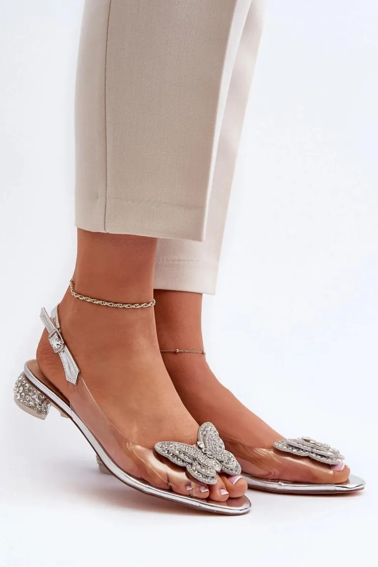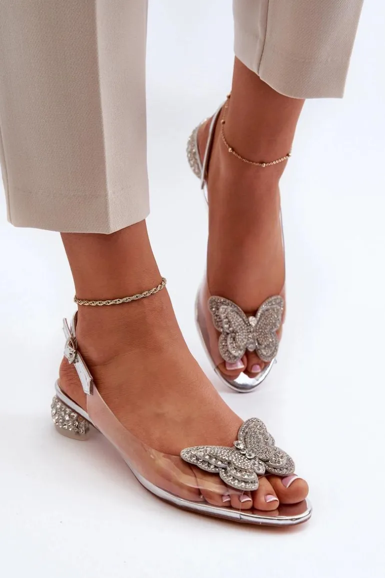 Modne sandały damskie z transparentną cholewką. Osadzone na niskim obcasie, który ozdobiony jest cyrkoniami. Z przodu ozdoba w postaci motyla. Zapinane na regulowany pasek ze sprzączką. Wkładka ze skóry naturalnej jest miękka i wygodna. Idealne na różne uroczystości oraz wieczorne wyjścia! Przy wyborze rozmiaru prosimy sugerować się tabelą rozmiarów.