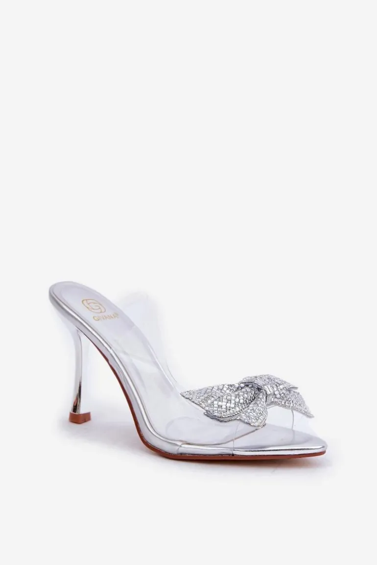Eleganckie transparentne sandały na szpilce, które idealnie podkreślą wyjątkowy charakter Twojej stylizacji. Model wyróżnia się efektowną, błyszczącą kokardą z przodu, dodającą odrobinę glamour. Model ten doskonale komponują się z sukniami koktajlowymi oraz eleganckimi kompletami, tworząc szykowny i modny look. Przy wyborze rozmiaru prosimy sugerować się tabelą rozmiarów.