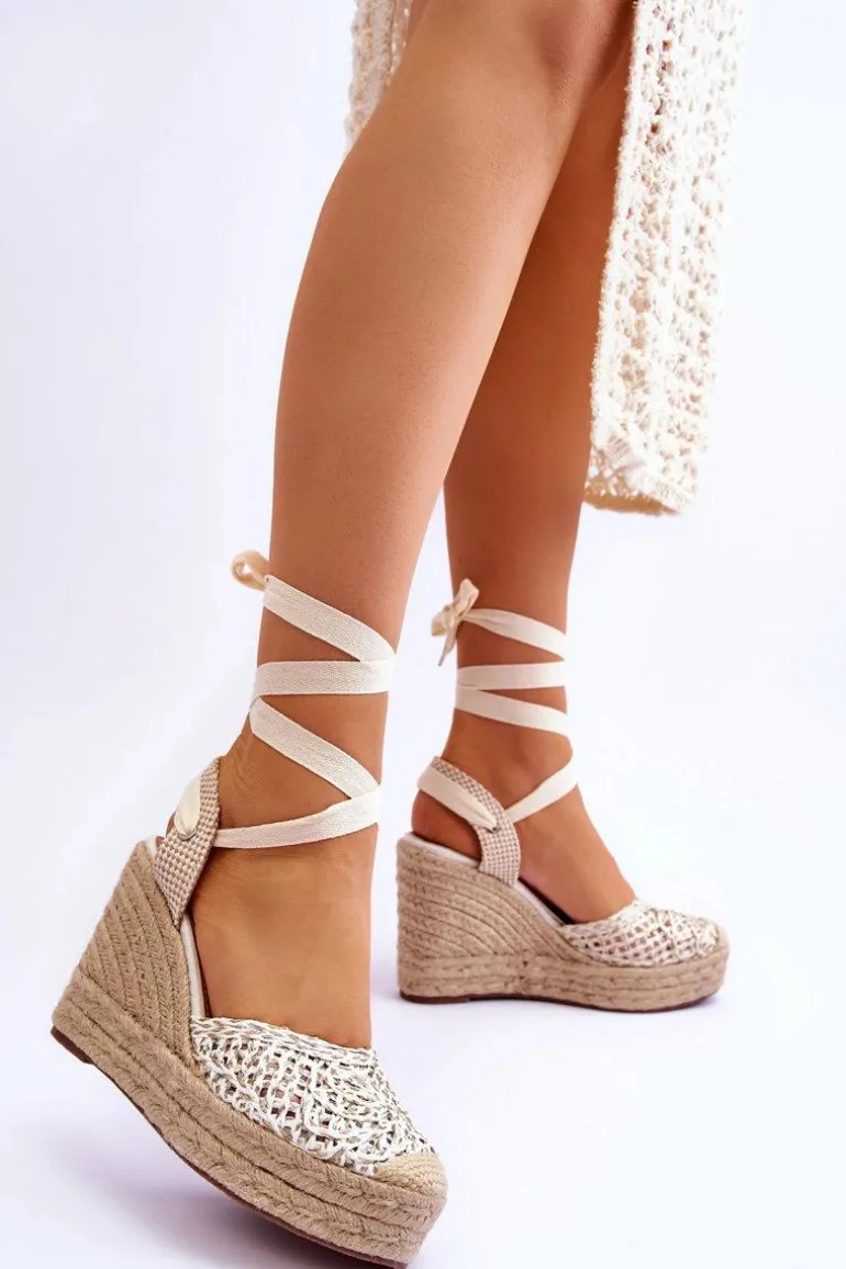 Modne i wygodne sandały osadzone na obcasie w postaci koturnu ozdobionego jutową plecionką. Sandały posiadają antypoślizgową podeszwę wykonaną z gumowego tworzywa. Cholewka została wykonana z połączenia tkaniny oraz tworzywa sztucznego. Sandałki posiadają wiązanie wokół kostki. Wkładka z eko skóry pozwala na komfortowe użytkowanie obuwia. Przy wyborze rozmiaru prosimy sugerować się tabelą rozmiarów.