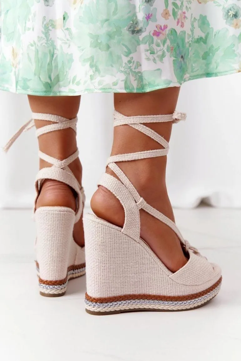 Piękne sandały na koturnie z wiązaniem wokół kostki. Sandały zostały wykonane z plecionej tkaniny, posiadają miękką wkładkę z eko skóry oraz antypoślizgową podeszwę. Wyjątkowy model wzbogaci Twoją letnią garderobę! Przy wyborze rozmiaru prosimy sugerować się tabelą rozmiarów.