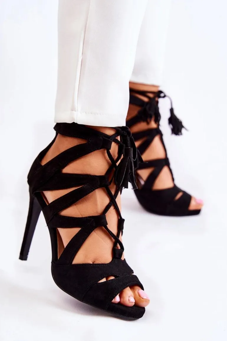 Modne sandały na obcasie w postaci szpilki. Posiadają wiązanie zakończone frędzlami, które pozwoli na odpowiednie dopasowanie obuwia. Sandałki optycznie wysmuklą nogi. O komfort zadba miękka wkładka wykonana z eko skóry. Cholewka z eko zamszu z wycięciami. Nosek odkryty, zaokrąglony. Eleganckie sandałki sprawdzą się na wiele okazji! Koniecznie powinnaś je mieć! Przy wyborze rozmiaru prosimy sugerować się tabelą rozmiarów.