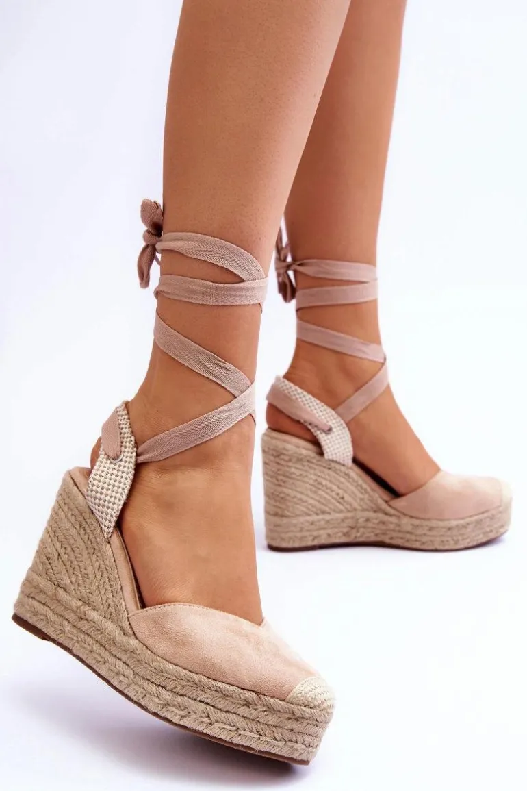 Wiązane Sandały Na Wysokim Koturnie Beżowe Lendy