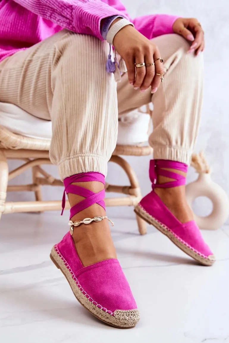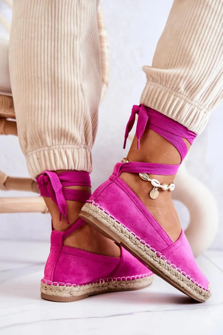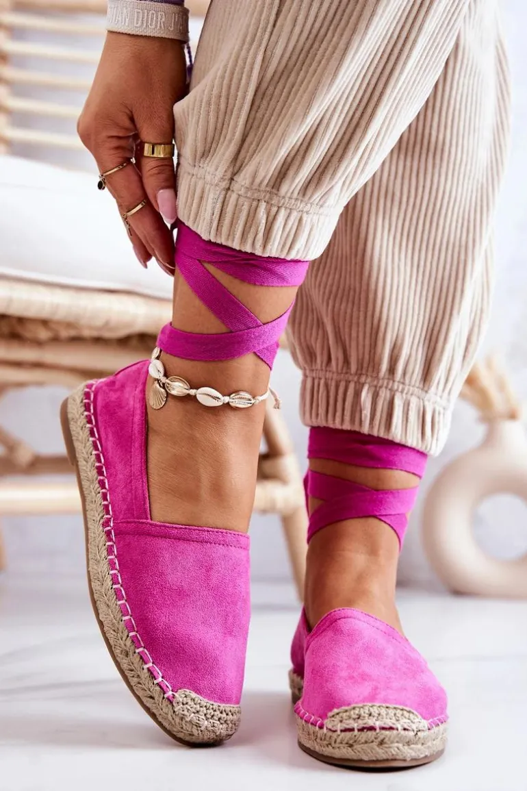 Klasyczne espadryle na płaskiej podeszwie. Wkładka wykonana z eko skóry. Ciekawy model, który powinnaś mieć w swojej garderobie! Eko zamszowe espadryle są wiązane wokół nogi. Materiałowy pasek jest wyciągany. Podeszwa antypoślizgowa oraz pleciona. Koniecznie sprawdź także pozostałą naszą kolekcję damskich espadryli.