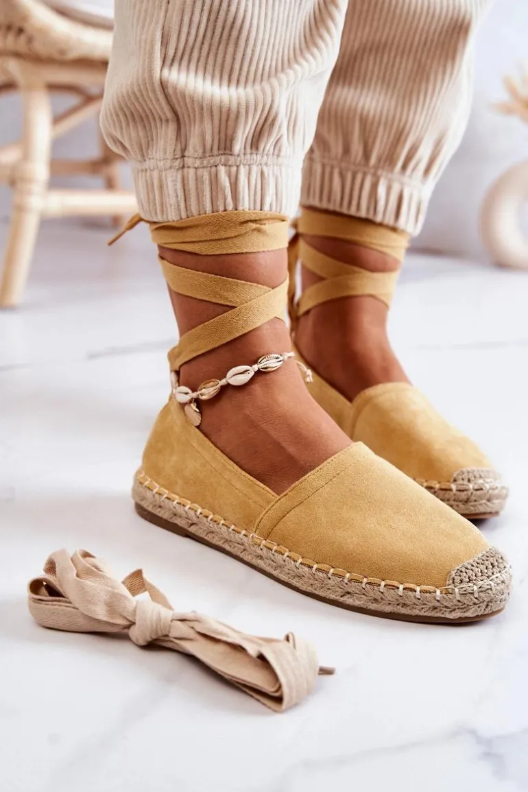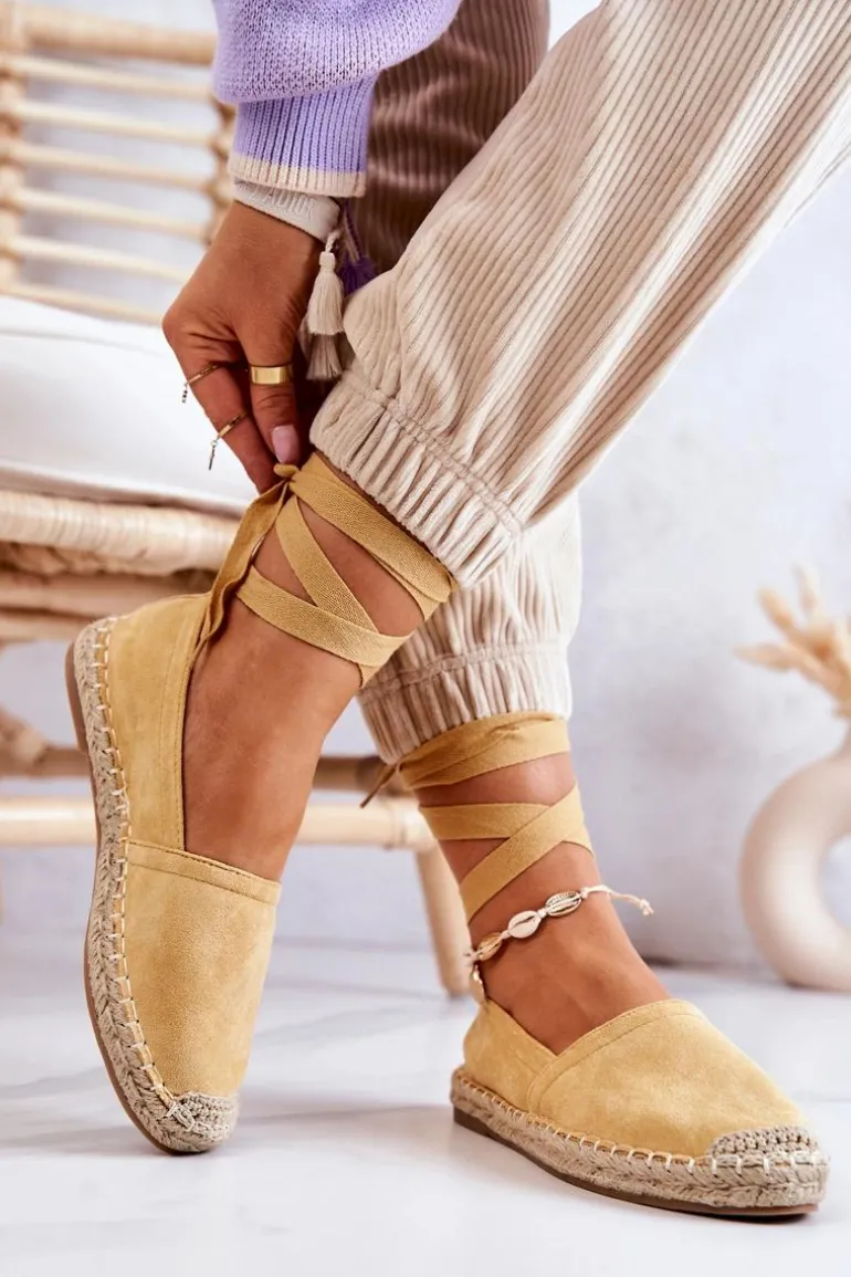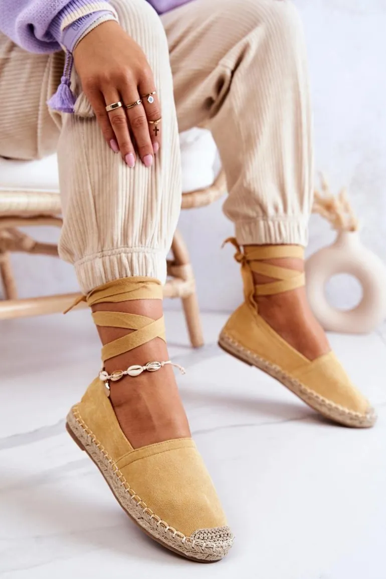 Klasyczne espadryle na płaskiej podeszwie. Wkładka wykonana z eko skóry. Ciekawy model, który powinnaś mieć w swojej garderobie! Eko zamszowe espadryle są wiązane wokół nogi. Materiałowy pasek jest wyciągany. Podeszwa antypoślizgowa oraz pleciona. Koniecznie sprawdź także pozostałą naszą kolekcję damskich espadryli.