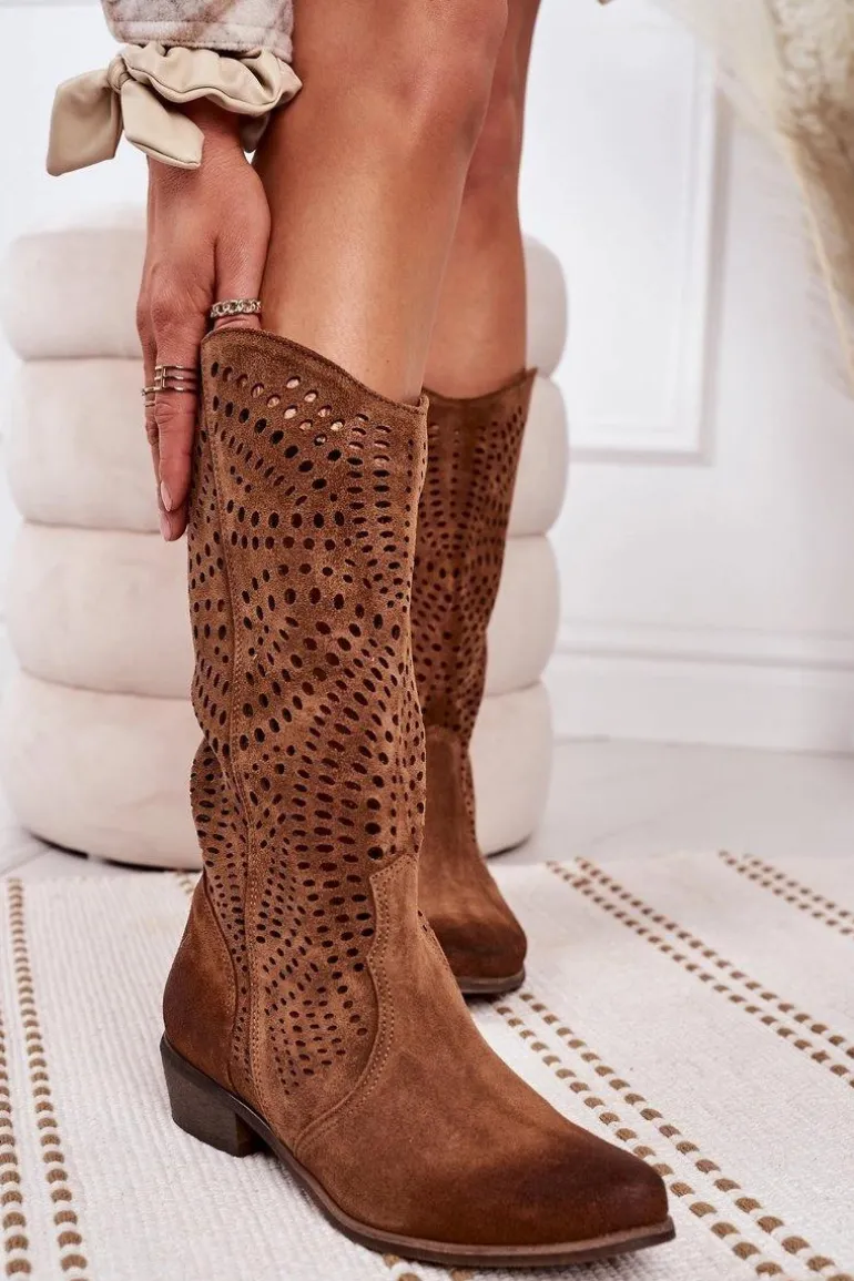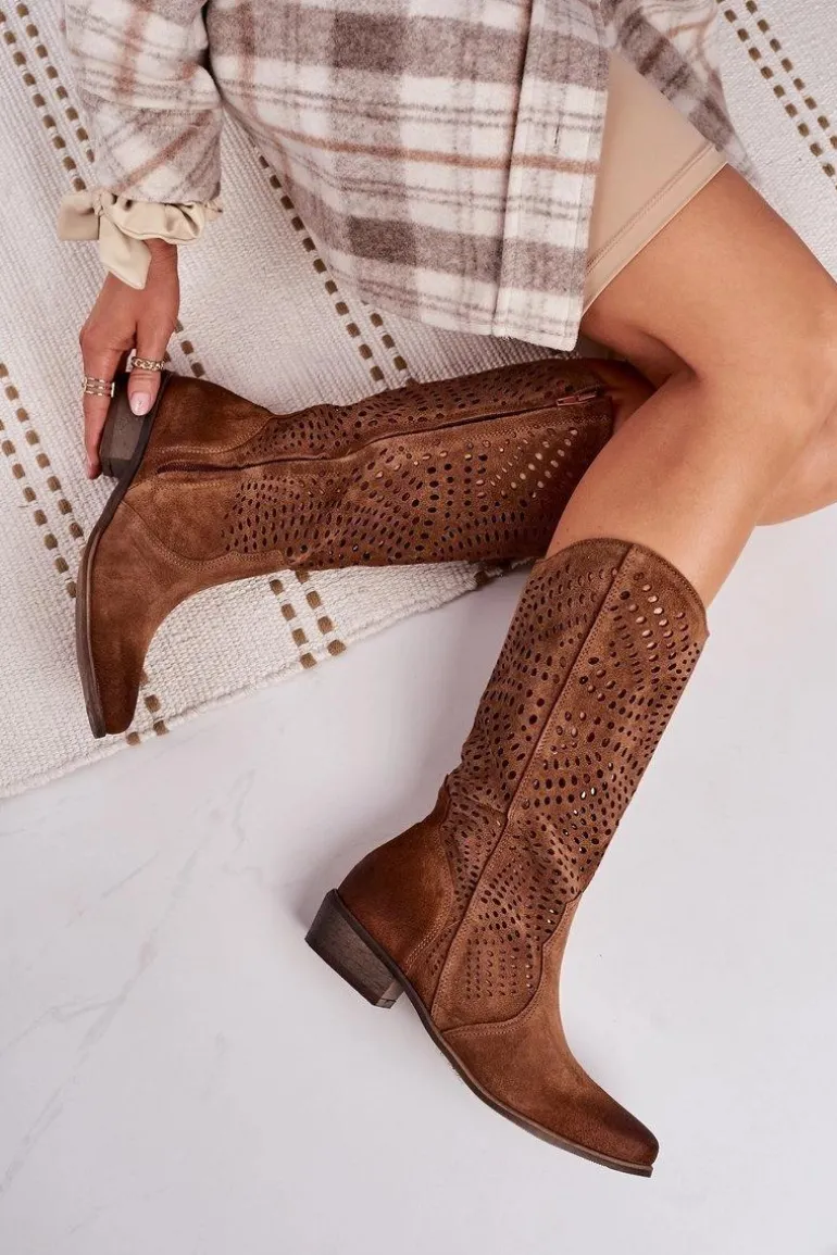 Wiosenne Ażurowe Kozaki Zamszowe Exquisite 1229 Koniak