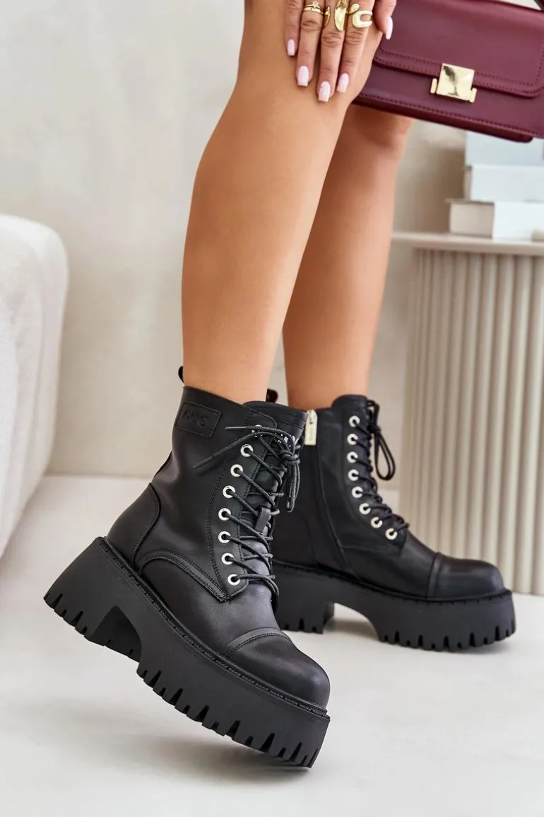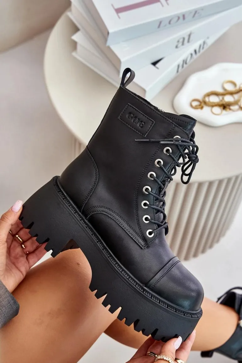 Botki od marki Goe to propozycja dla kobiet ceniących nowoczesny styl i wygodę. Wykonane ze skóry naturalnej. Osadzone na masywnej platformie i płaskim obcasie, zapewniają komfort i stabilność na każdym kroku. Model zapinany na zamek oraz sznurowany, co ułatwia dopasowanie do stopy. Zaokrąglone noski dodają im subtelnego wyglądu, idealnego do codziennych stylizacji. Przy wyborze rozmiaru prosimy kierować się tabelą rozmiarów