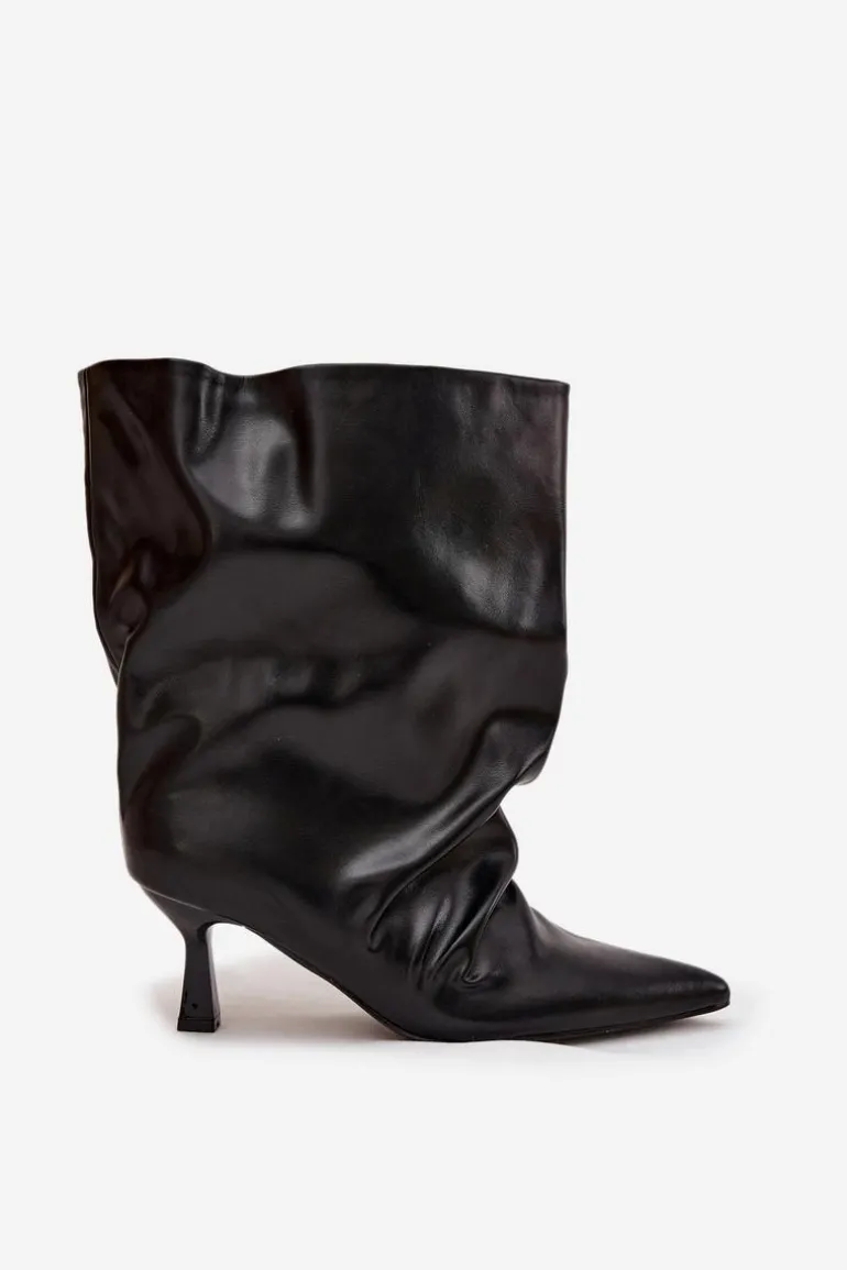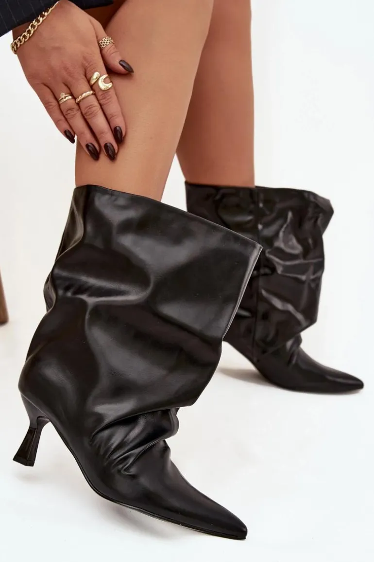 Botki damskie wykonane z eko skóry to stylowy model, który łączy elegancję z modnym akcentem. Osadzone na smukłej szpilce, pięknie podkreślają sylwetkę i dodają kobiecego wdzięku. Wsuwany fason zapewnia wygodę zakładania, a szeroka, marszczona cholewka nadaje im wyjątkowego, nowoczesnego charakteru. To efektowne botki, które doskonale uzupełnią zarówno codzienne, jak i wieczorowe stylizacje. Przy wyborze rozmiaru prosimy sugerować się tabelą rozmiarów.