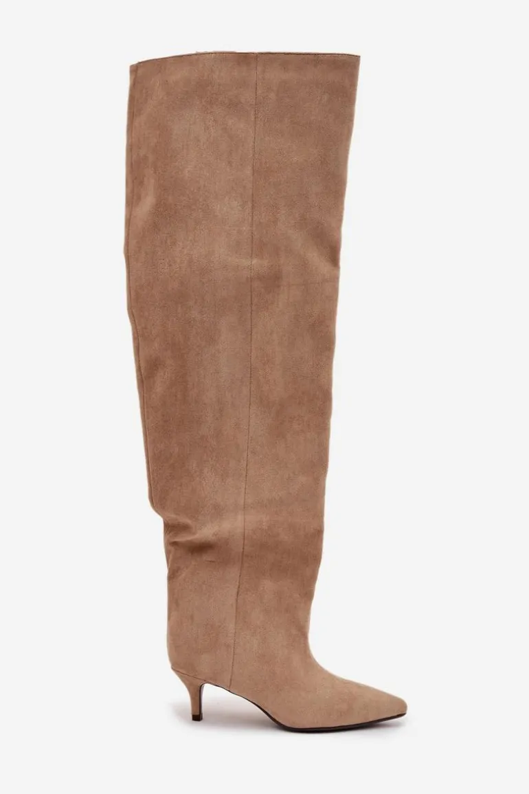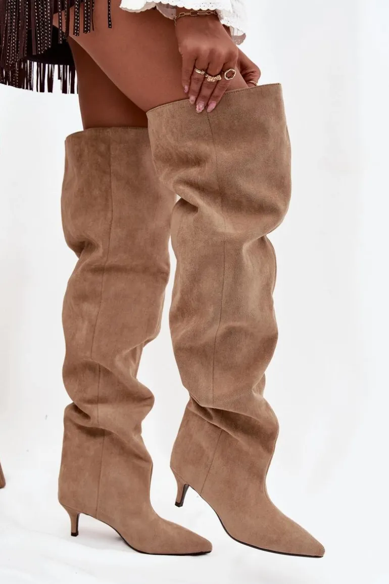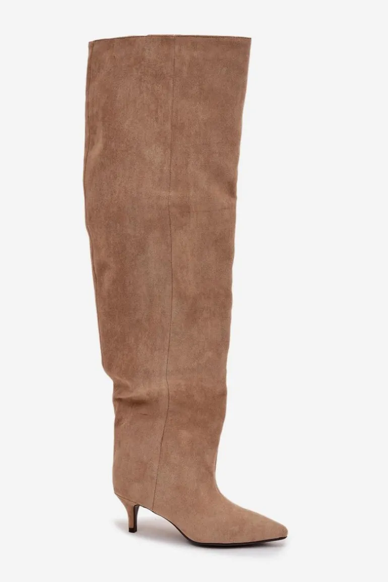 Kozaki damskie wykonane z eko zamszu. Model został osadzony na niskiej szpilce. Charakterystyczną cechą butów jest szeroka cholewka, która nie tylko nadaje im modnego wyglądu, ale również sprawia, że kozaki są wygodne w noszeniu i łatwe do dopasowania do każdej nogi. Wsuwany fason ułatwia szybkie zakładanie i zdejmowanie, czyniąc obuwie praktycznym w codziennym użytkowaniu. To kozaki, które doskonale sprawdzą się zarówno w zestawieniach casualowych, jak i bardziej eleganckich stylizacjach, dodając im wyrafinowanego charakteru. Przy wyborze rozmiaru prosimy kierować tabelą rozmiarów.