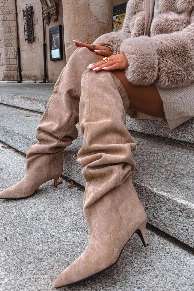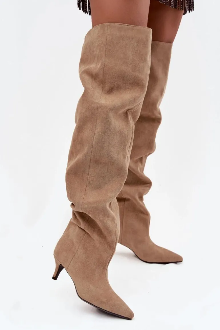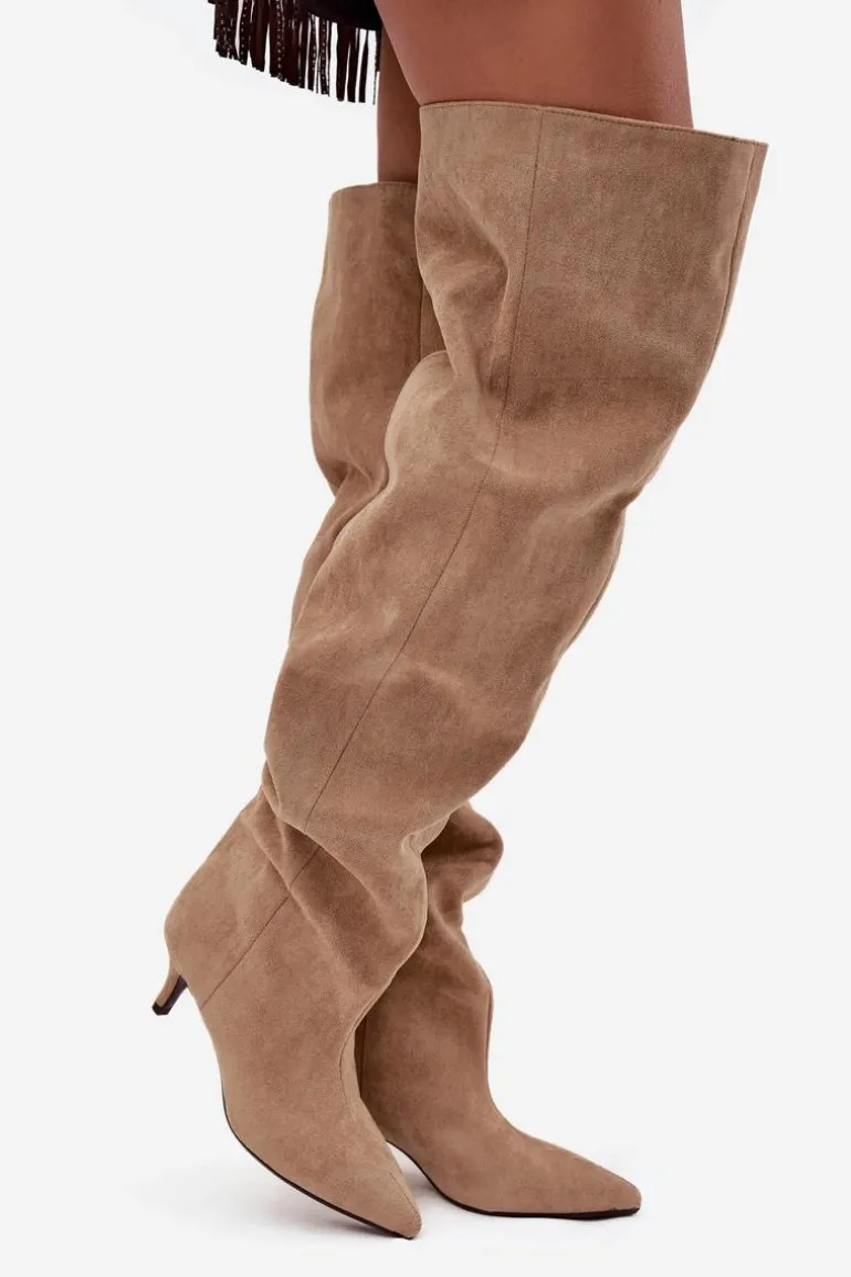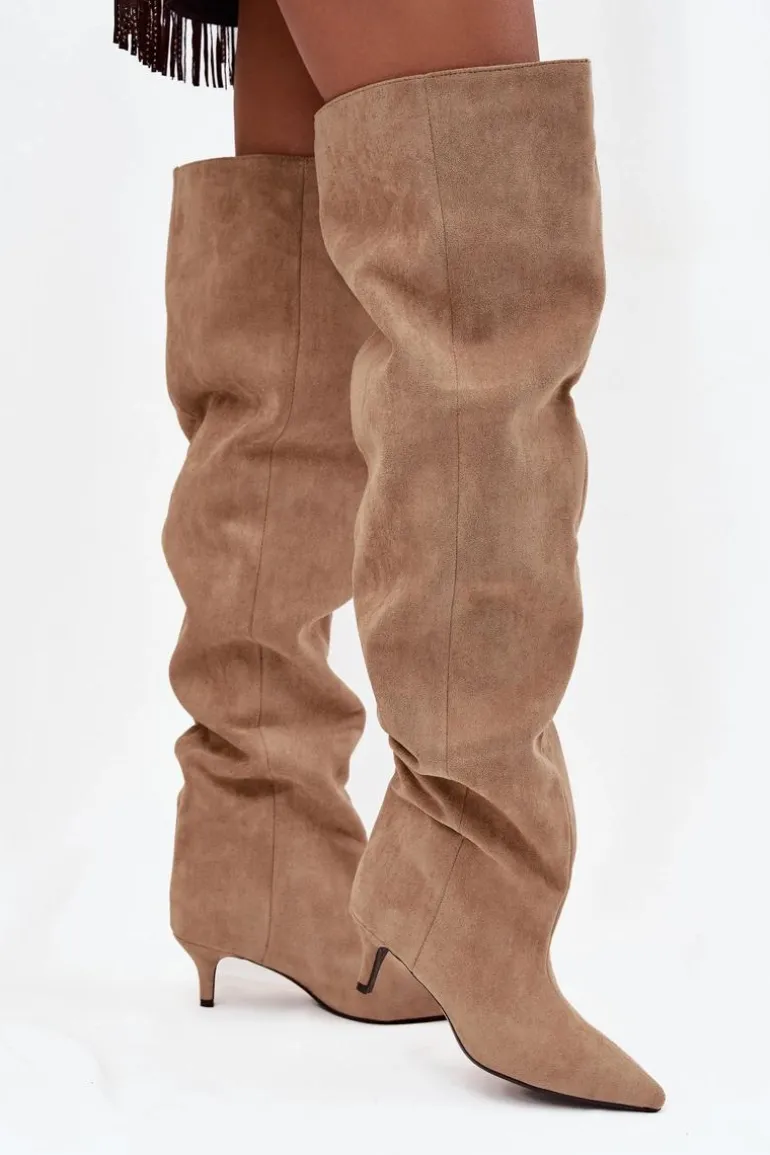 Kozaki damskie wykonane z eko zamszu. Model został osadzony na niskiej szpilce. Charakterystyczną cechą butów jest szeroka cholewka, która nie tylko nadaje im modnego wyglądu, ale również sprawia, że kozaki są wygodne w noszeniu i łatwe do dopasowania do każdej nogi. Wsuwany fason ułatwia szybkie zakładanie i zdejmowanie, czyniąc obuwie praktycznym w codziennym użytkowaniu. To kozaki, które doskonale sprawdzą się zarówno w zestawieniach casualowych, jak i bardziej eleganckich stylizacjach, dodając im wyrafinowanego charakteru. Przy wyborze rozmiaru prosimy kierować tabelą rozmiarów.