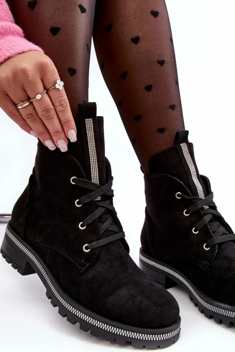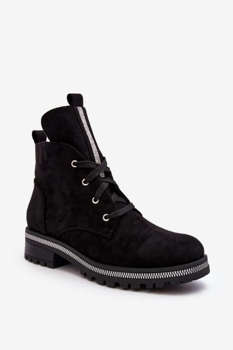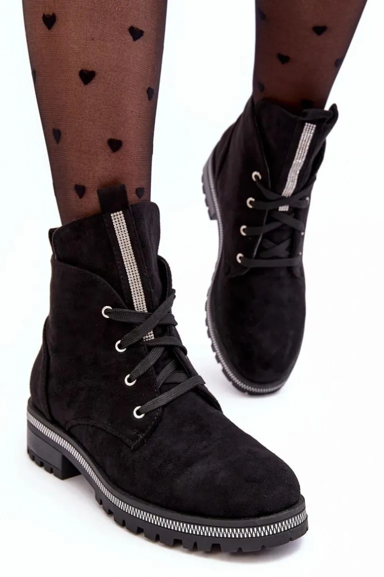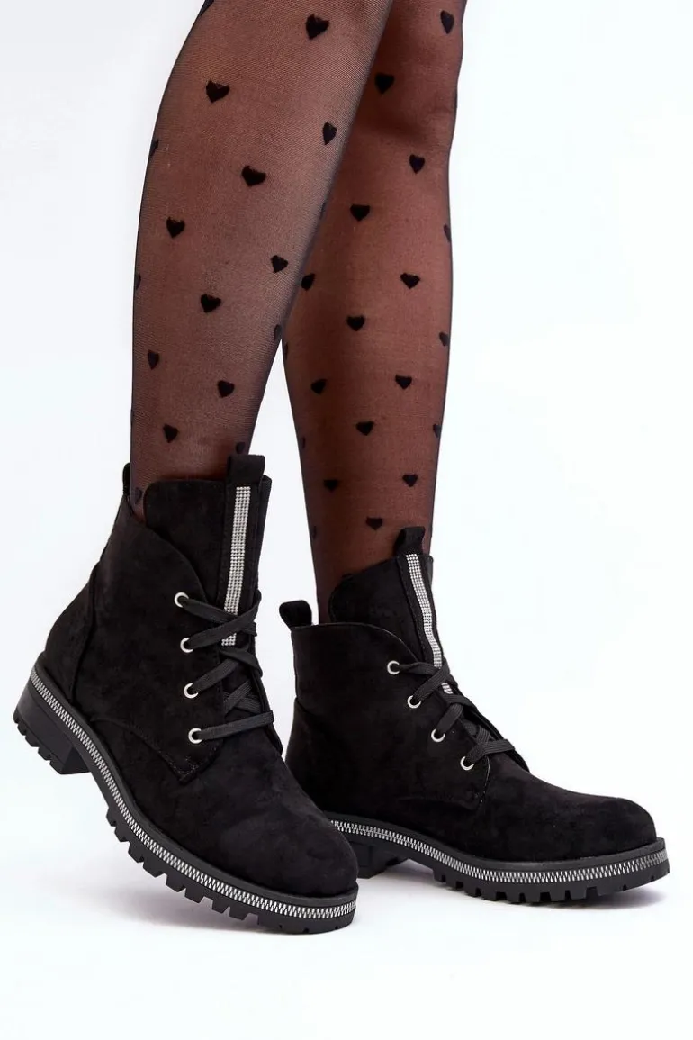 Botki damskie z niską cholewką wykonane z eko zamszu. Model wsuwany ze sznurowaniem. Noski zaokrąglone. Środek ocieplony kocem obuwniczym. Usztywniony zapiętek. Płaski obcas zapewni stabilność na każdym kroku. Małe, błyszczące dżety na języku. Koniecznie powinnaś mieć ten model w swojej szafie! Przy wyborze rozmiaru prosimy sugerować się tabelą rozmiarów.