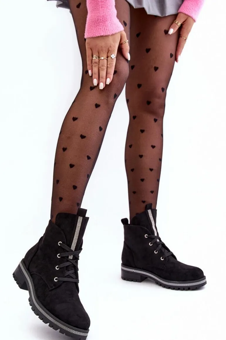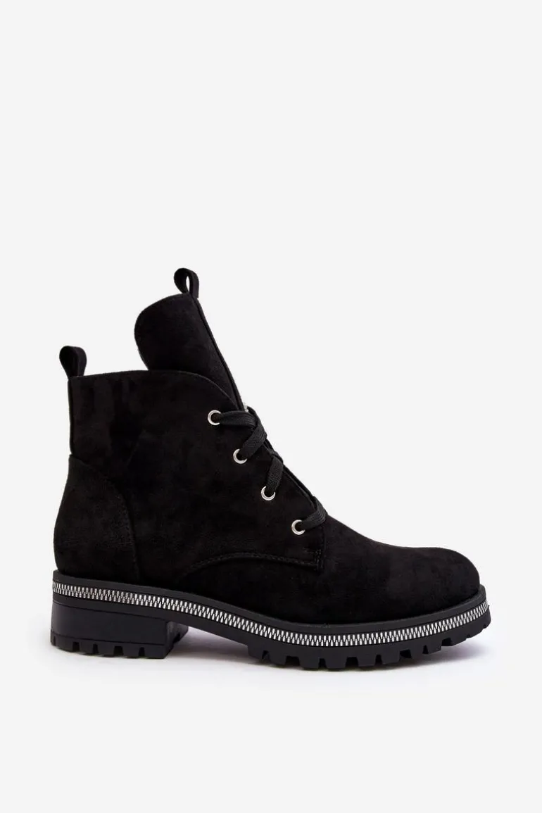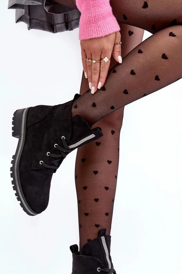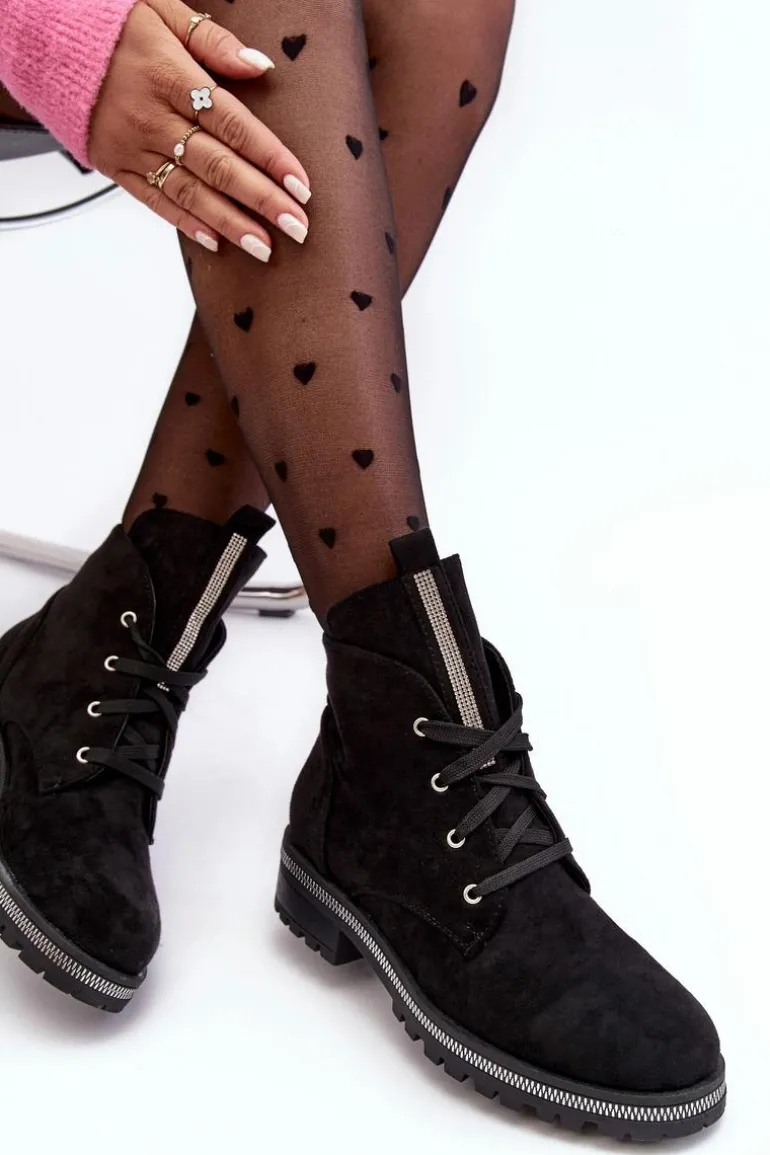 Botki damskie z niską cholewką wykonane z eko zamszu. Model wsuwany ze sznurowaniem. Noski zaokrąglone. Środek ocieplony kocem obuwniczym. Usztywniony zapiętek. Płaski obcas zapewni stabilność na każdym kroku. Małe, błyszczące dżety na języku. Koniecznie powinnaś mieć ten model w swojej szafie! Przy wyborze rozmiaru prosimy sugerować się tabelą rozmiarów.