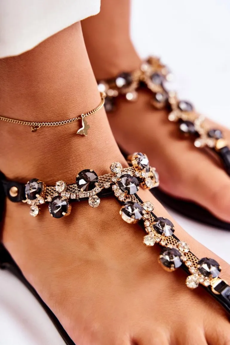 Wygodne sandały w stylu japonek świetnie prezentują się z letnimi stylizacjami. Buty te zostały wykonane z eko skóry. Wkładka jest dodatkowo pikowana. Na paseczkach znajdują się dżety w postaci kryształów oraz cyrkonii. Model zapinany na sprzączkę z regulowanym paskiem, dzięki któremu możesz je odpowiednio dopasować do tęgości nogi. Osadzone na płaskim obcasie z antypoślizgową podeszwą. Przy wyborze rozmiaru prosimy kierować się tabelą rozmiarów.