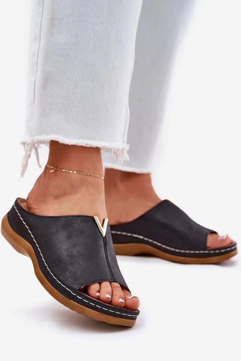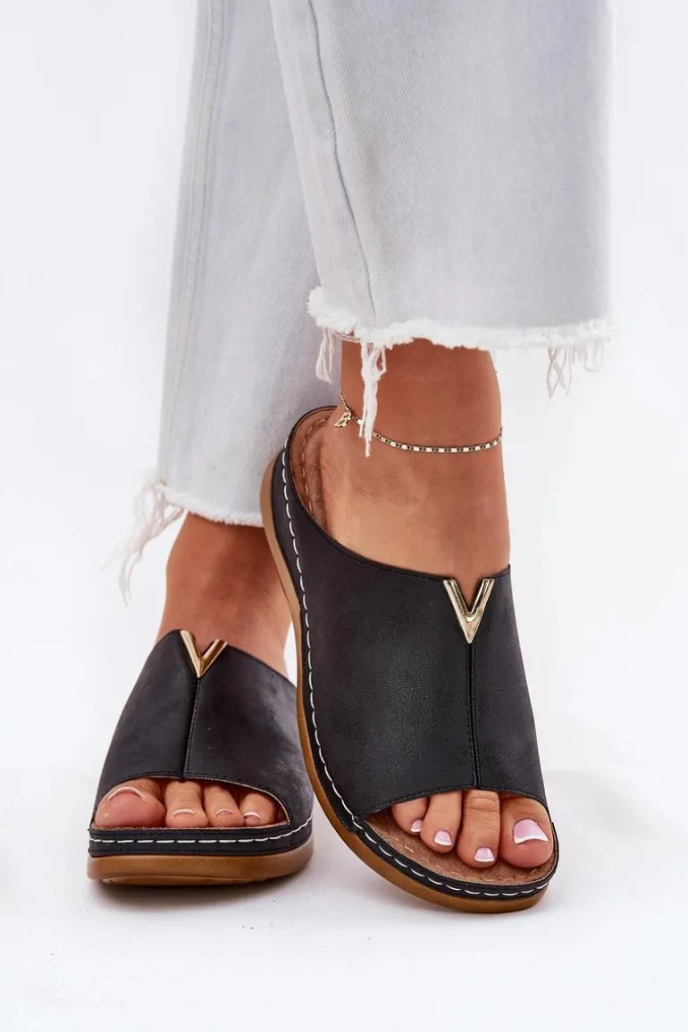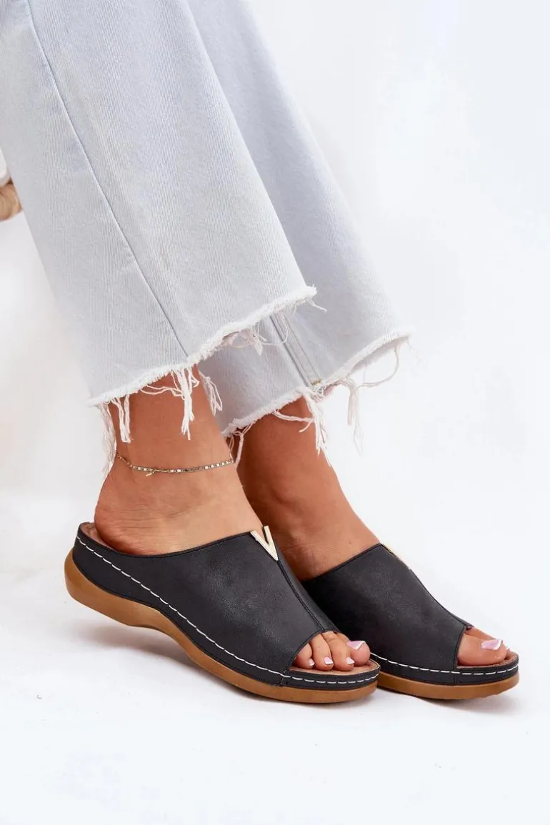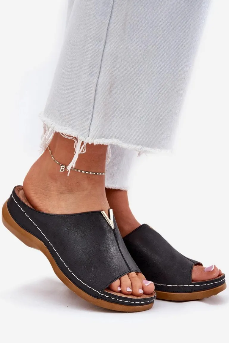 Eleganckie damskie klapki wykonane z eko skóry to połączenie stylu i komfortu. Osadzone na koturnie, zapewniają lekkość oraz stabilność przez cały dzień. Model ten posiada miękką wkładkę Comfortshoe z efektem poduszki, co gwarantuje wygodę nawet przy długotrwałym noszeniu. Te klapki doskonale komponują się z codziennymi stylizacjami, łącząc elegancję z funkcjonalnością. Idealne na ciepłe dni! Przy wyborze rozmiaru prosimy sugerować się tabelą rozmiarów.