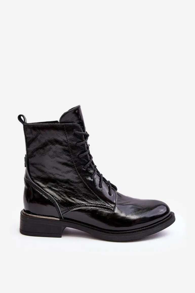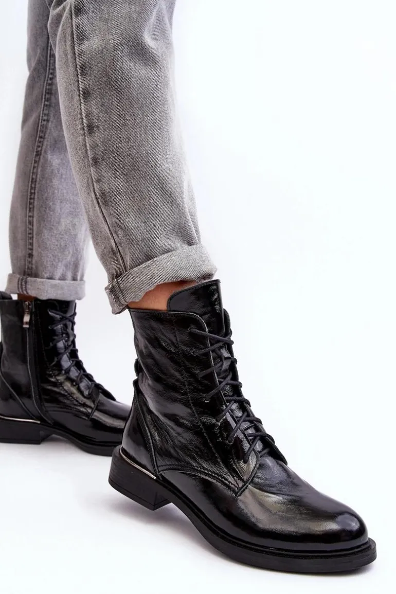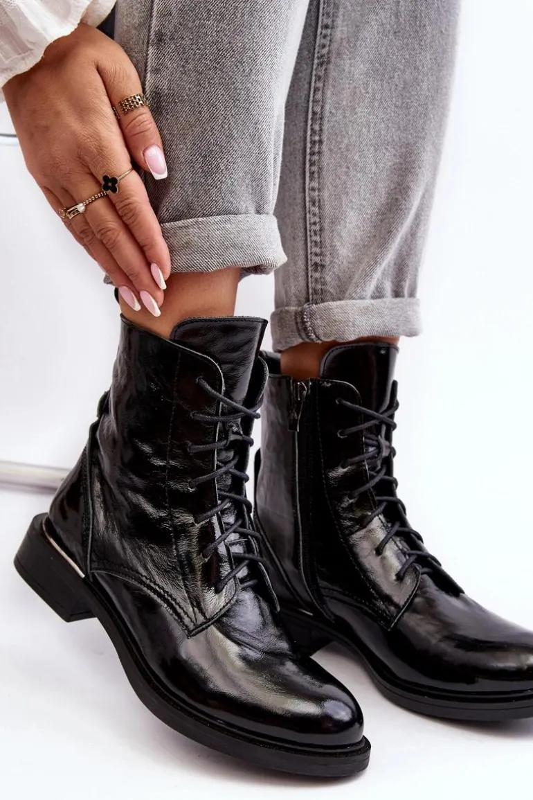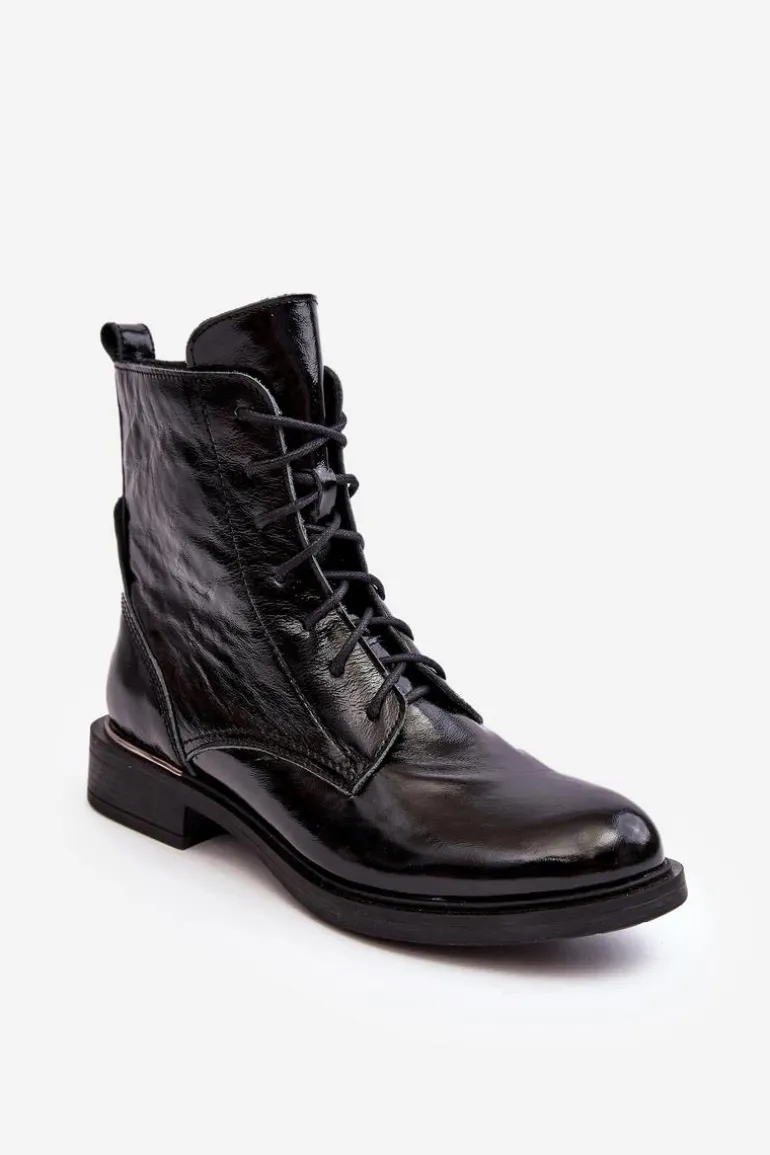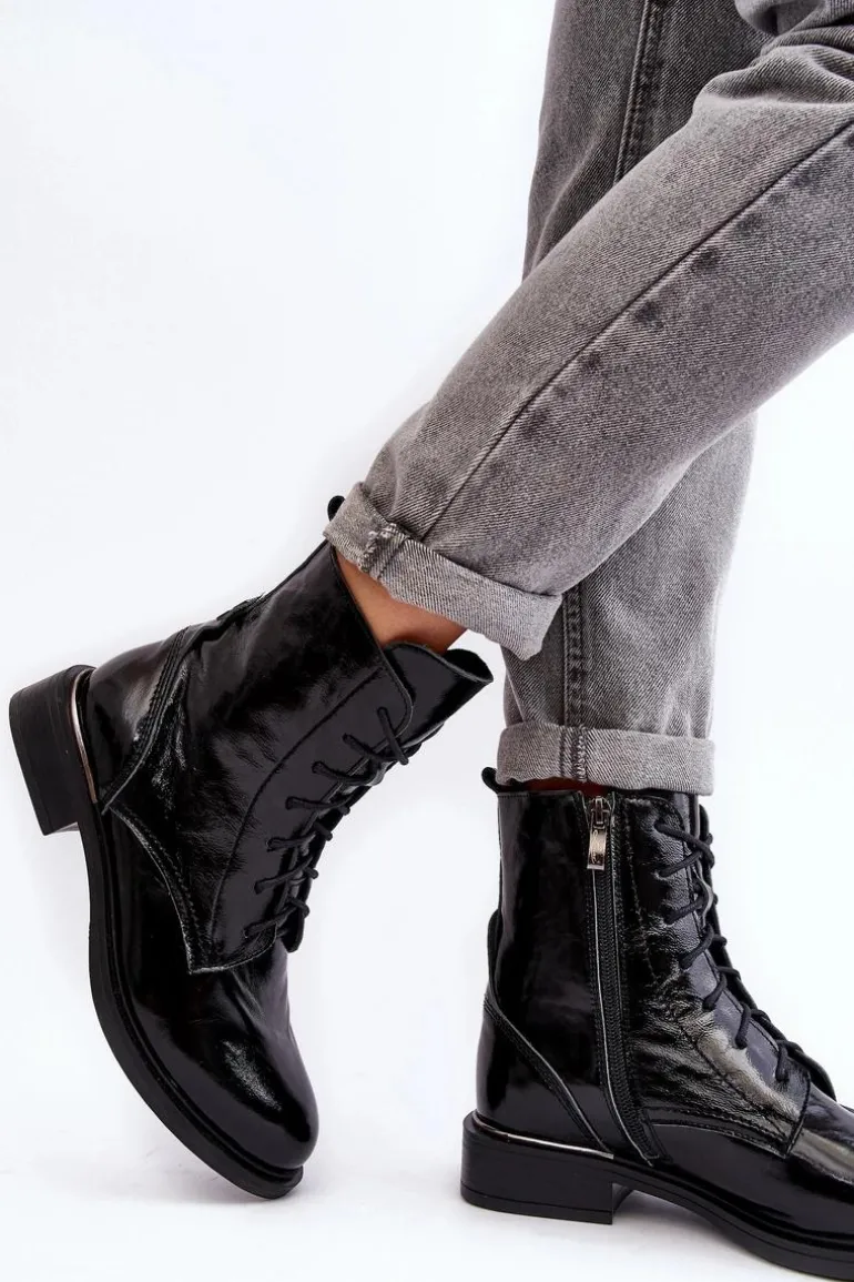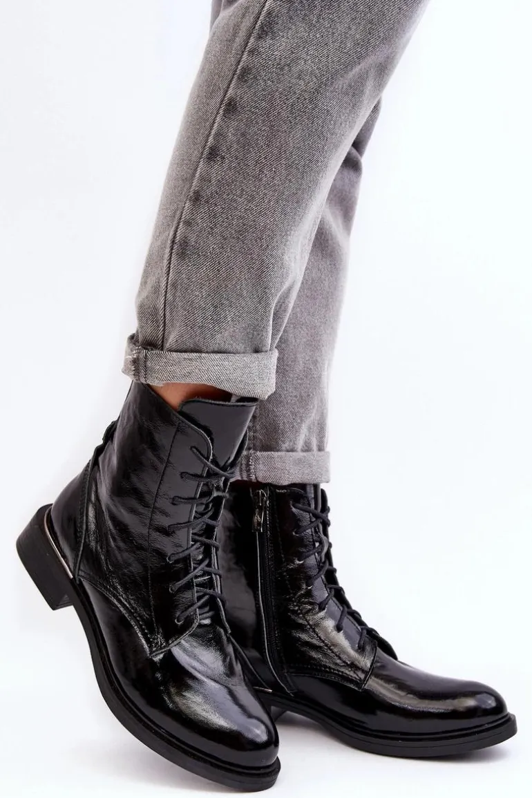 Klasyczne botki damskie zostały wykonane z wysokiej jakości naturalnych skór. Model ten posiada klasyczne sznurowanie oraz suwak z boku cholewki. Usztywniany zapiętek zapewni stabilizację stopy. Botki zostały ocieplone kocem obuwniczym. Osadzone na płaskim obcasie i delikatnej platformie. Przy wyborze rozmiaru prosimy sugerować się tabelą rozmiarów.
