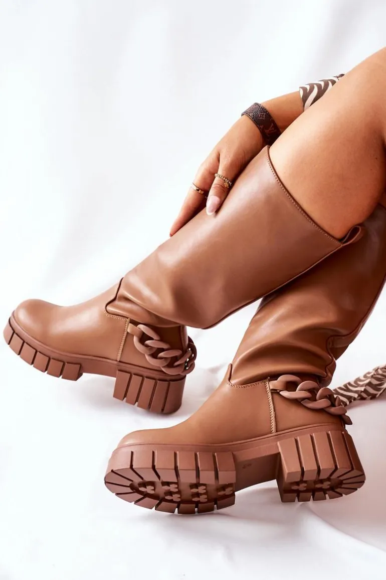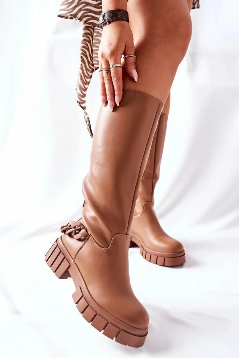 Kozaki za kolano wykonane z elastycznej tkaniny. Wnętrze ocieplone jest kocem obuwniczym.