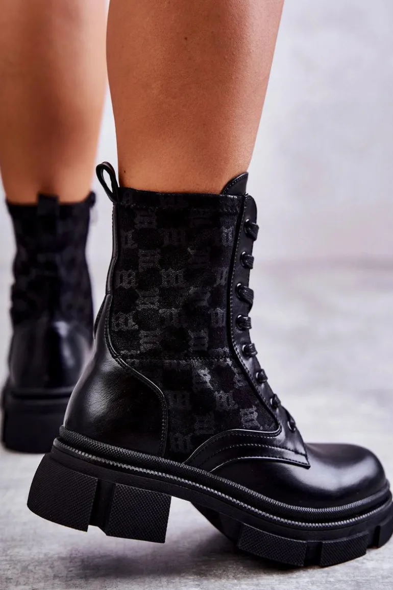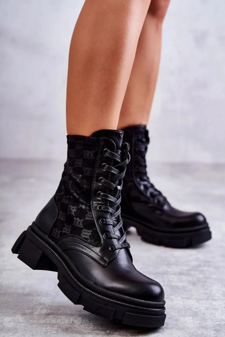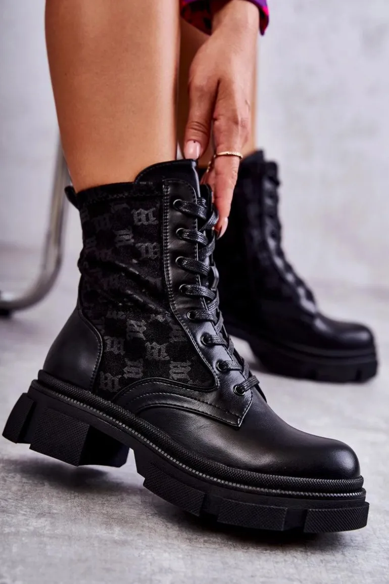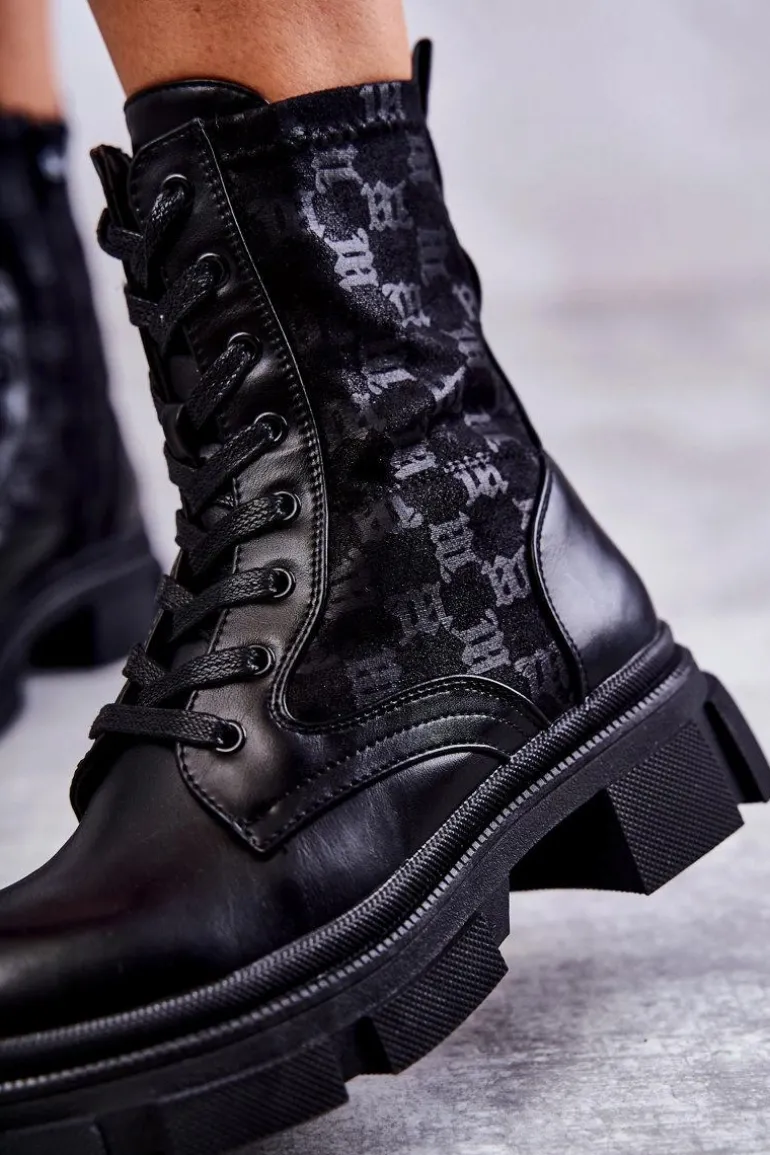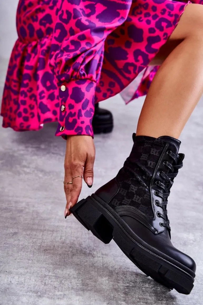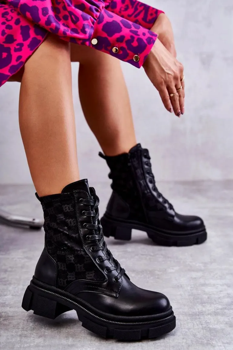 Wysokie botki z cholewką za kostkę zostały wykonane z połączenia eko skóry oraz materiału tekstylnego. Model z usztywnianym zapiętkiem. Botki te posiadają suwak ułatwiający zakładanie obuwia oraz wiązanie pozwalające na odpowiednie dopasowanie obuwia do tęgości nogi. Osadzone na platformie i płaskim obcasie. Wkładka materiałowa. Przy wyborze rozmiaru prosimy sugerować się tabelą rozmiarów.