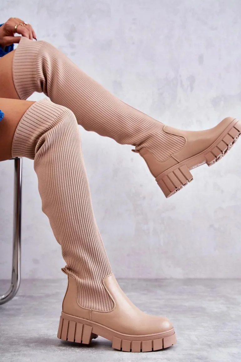 Modne damskie kozaki zostały wykonane z połączenia eko skóry oraz prążkowanej tkaniny. Cholewka za kolano. Model osadzony na płaskim obcasie i delikatnej platformie ze żłobieniami. Buty te posiadają ocieplaną wkładkę. Nosek zaokrąglony. Model wsuwany. Świetnie będą prezentować się z sukienkami lub spódniczkami mini. Przy wyborze rozmiaru prosimy kierować tabelą rozmiarów.