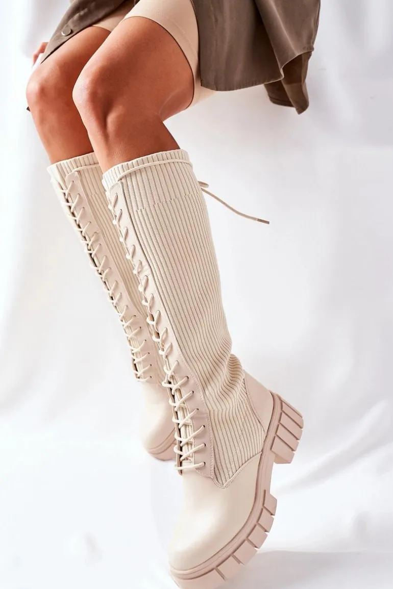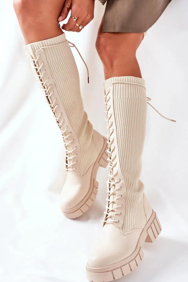 Wysokie sznurowane kozaki. Cholewka w postaci skarpety. Sznurowanie po całej długości zapewni odpowiednie dopasowanie do nogi. Przy wyborze rozmiaru prosimy sugerować się tabelą rozmiarów.
